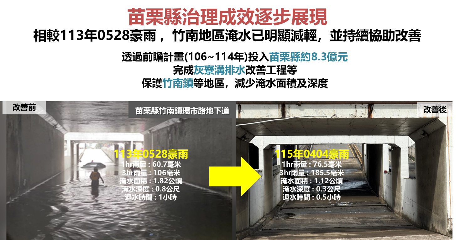 (二)歷年協助地方治水計畫已展現成效:於歷次極端氣候獲得驗證,本次事件大部分淹水深度介於10-30公分,例如苗栗縣灰寮溝排水經過整治後,已大幅改善苗栗竹南及頭份地區過去經常淹水情形,針對尚未完成治理的區域,將以系統性治理策略,持續協助地方改善水患。