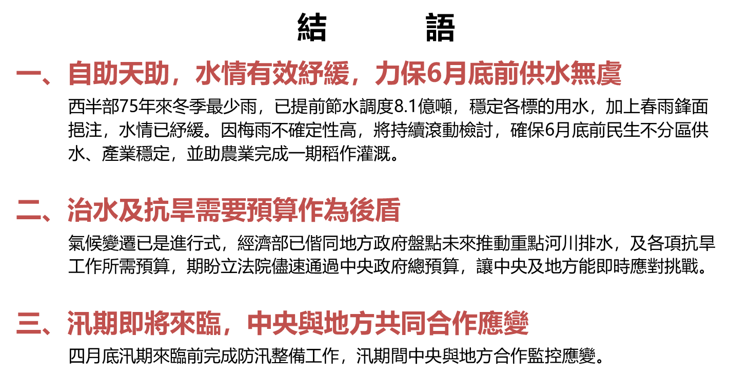 (三)期盼立法院儘速通過中央政府總預算:本次0404豪雨雖造成部分淹水災情但雨勢減緩後已立即退水,顯見歷年治水工作已有成效;而先前透過提前部署,強化管理調配減少旱象的衝擊,均需仰賴預算支應。在面對氣候變遷帶來極端降雨或旱象的挑戰下,抗旱或治水等應變能力都需要有充足的預算作為後盾。行政院已核定4年1000億元「因應氣候變遷縣市管河川及排水整體改善計畫(115-118年)」,並已提出115年預算送立法院審議,相關抗旱及治水計畫預算,期盼立法院儘速通過,讓中央及地方政府能即時應對氣候變遷帶來挑戰。