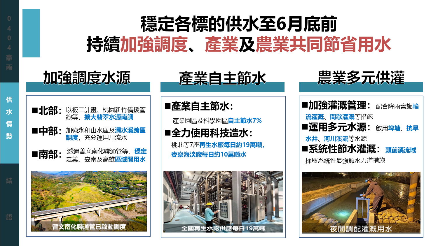(四)穩定各標的供水至6月底前:持續加強調度水源,產業加強自主節水及全力使用科技造水,農業採行多元供灌,透過加強灌溉管理、運用多元水源及系統性節水灌溉等措施,共同節省用水。