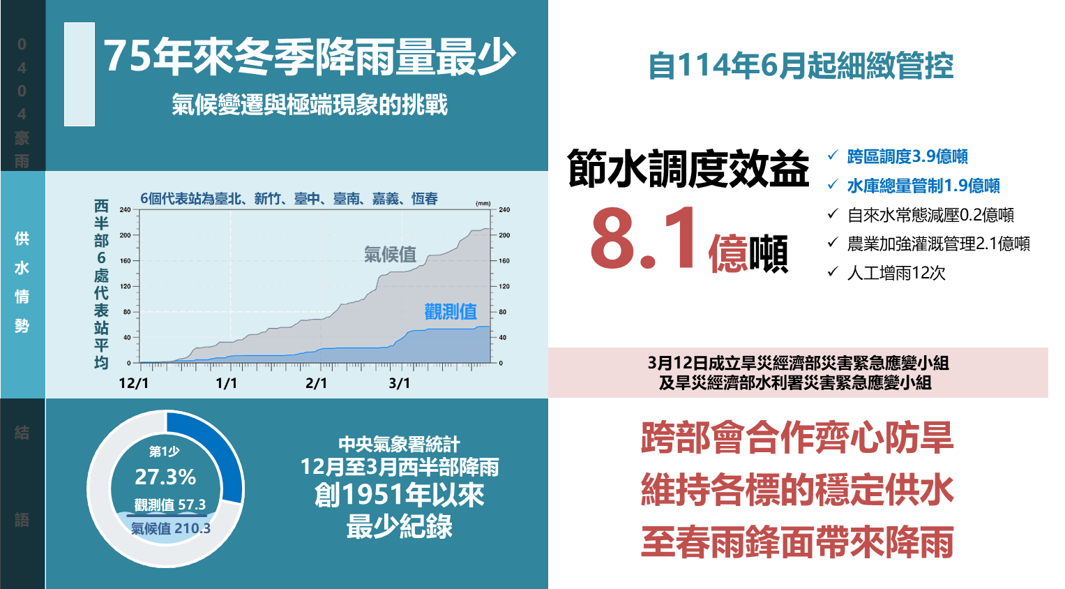 (一)降雨雖為75年以來最少,提前因應節水調度效益達8.1億噸:中央氣象署統計去年12月至3月西半部降雨為1951年最少,經濟部自去年6月即跨部會合作齊心防旱,維持各標的穩定供水,至春雨鋒面帶來降雨;整體節水效益約4座石門水庫水量。