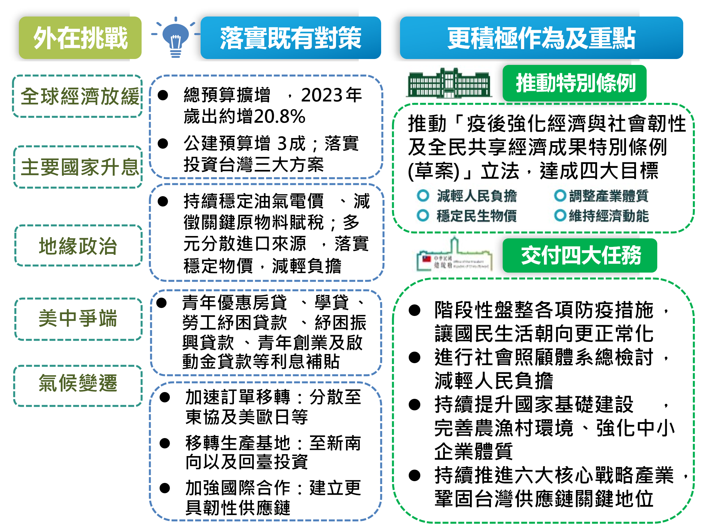 政府當前除審慎關注全球變局發展,並將加快步伐落實推動各項施政,強化國家在經濟、社會和建設上的堅韌;另一方面,為穩定經濟成長動能,同時將目前經濟成果與全民共享,政府已擬具「疫後強化經濟與社會韌性及全民共享經濟成果特別條例」草案,並送請立法院審議,盼本條例儘速三讀通過,讓臺灣經濟成長持續向前行。
