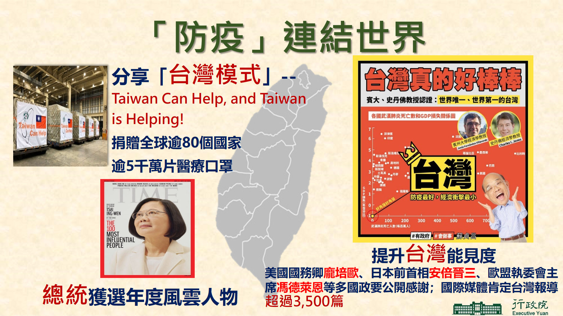 2020年為充滿艱困挑戰的一年,武漢肺炎全球延燒,美中對抗升級,中國對我文攻武嚇,機艦密集擾臺。面對危機,政府化為轉機,不但在防疫、經濟獲致成就,也在推動踏實外交、國防自主方面,獲得豐碩成果,民調深獲國人肯定。