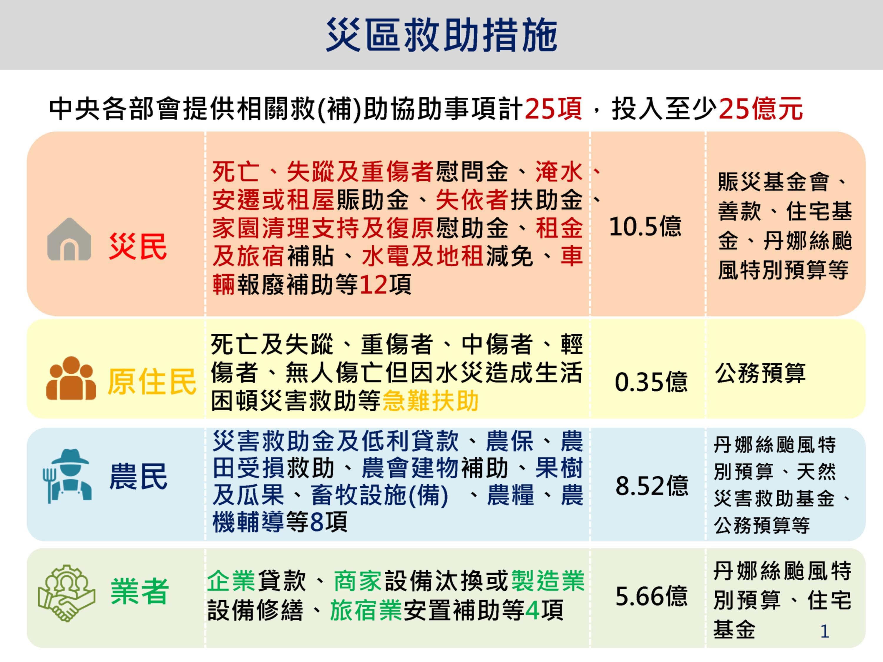 行政院業依丹娜絲風災特別條例將花蓮全區劃定為災區,而0923花蓮馬太鞍溪堰塞湖災害,將依此特別條例延續補助方向,且丹娜絲特別預算本來就有編列堰塞湖處理預算,加上災害預備金也能因應。考量堰塞湖溢流導致之災損、農損、公共設施毀損及其他相關損失,災情特別嚴重,為加速救助金之發放,已由行政院陳政務委員金德多次召會及趕赴現地瞭解災民實際需求,提出程序簡化措施,並將於下週二(10月7日)由陳政委率各相關部會赴災區聯合成立「一站式服務平台」,提供相關救助措施之宣傳、諮詢及直接受理民眾申請,請各部會務必以「從速、從簡」原則認定發放各項救助金,以有效回應受災民眾的急迫需求。至有關死亡及失蹤者慰問金由中央發放每位100萬元部分,亦已於本(2)日由前進協調所總協調官季政委陪同蕭副總統赴瑞穗生命園區致贈罹難者家屬,並致上最深切的慰問之意。