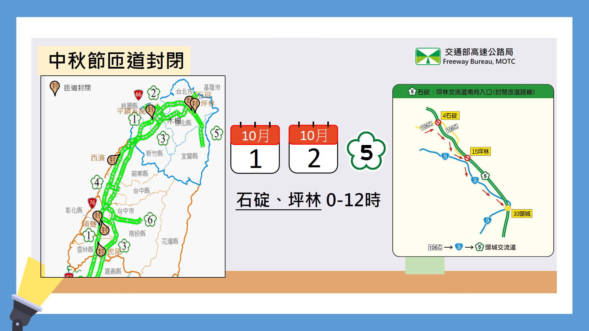 一、國道5號於10月1日及10月2日0至12時封閉坪林及石碇南向匝道入口(石碇交流道封閉期間改為大客車專用),高速公路局、公路總局將透過CMS與標誌牌面宣導封閉訊息及改道台9線或106乙路線,請前往宜花東的用路人應多加注意。