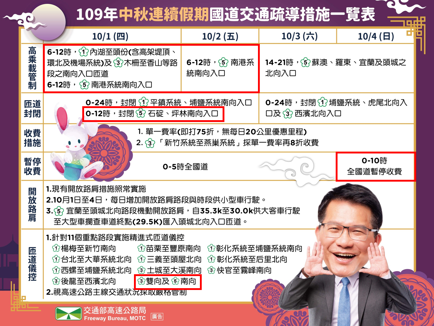 一、國道除實施匝道封閉、入口高承載管制(提早自6時開始)及匝道儀控外,另10月1日至10月3日,每日0至5時國道全線暫停收費;10月4日當日0至10時全線暫停收費。