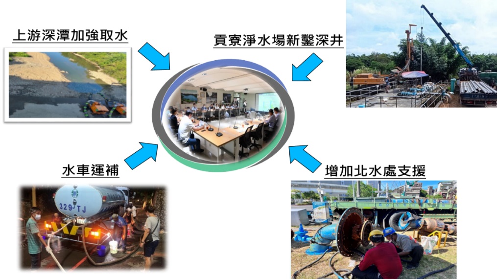 為解決高地區缺水問題,經濟部即組成應變小組,由台水公司及水利署合作,採取管網調配、重啟舊有供水網路、上游深潭加強取水及新鑿深井等作為,延緩雙溪貢寮堰水位降低,水利署並協請國軍、民間企業等搭配台水公司超過百輛水車支援運補,水車直接運補社區蓄水池,大幅降低民眾用水不便,透過各界齊心抗旱終撐到天降甘霖,台水公司將持續自基隆河抽取蓄存新山水庫,預估至10月中旬蓄水量可達650萬噸(65%)以上,目前供水正常。