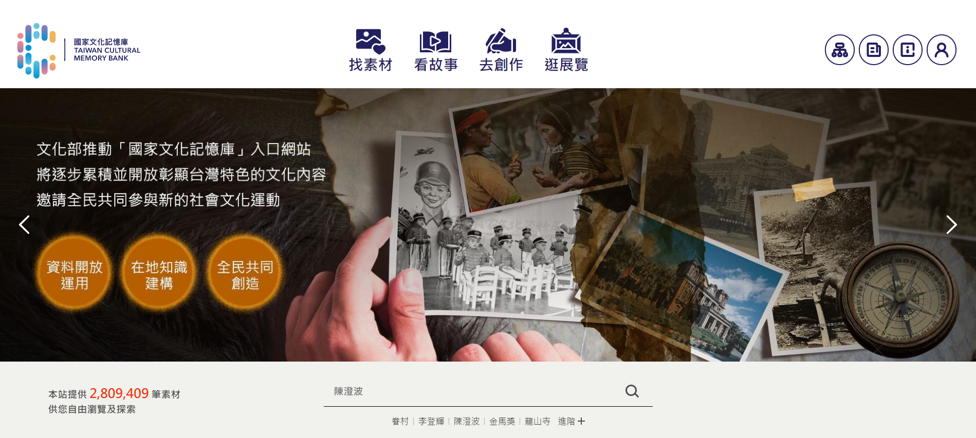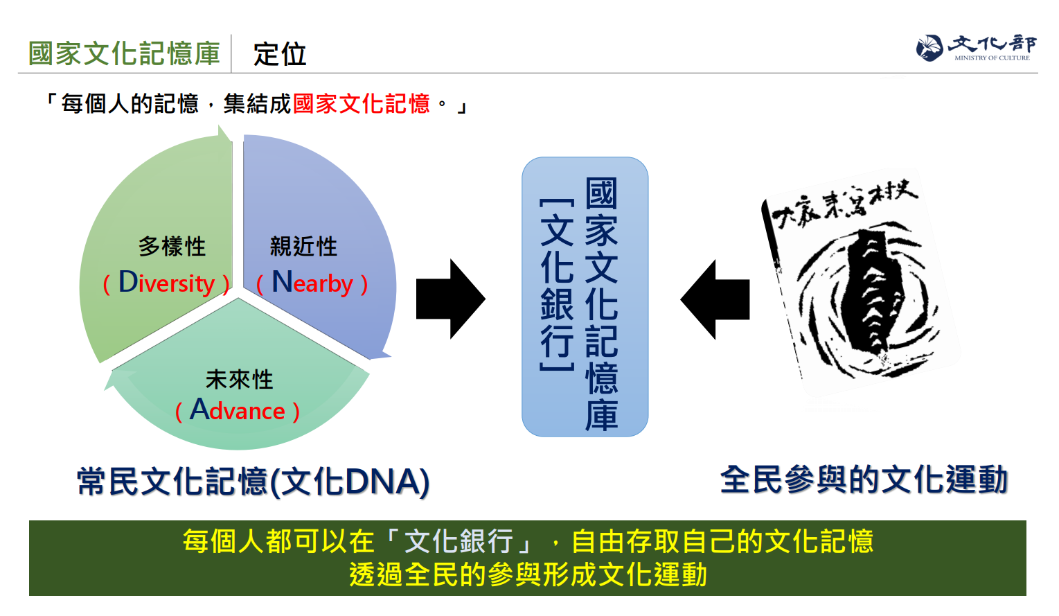 「國家文化記憶庫」以單一入口網站,提供豐富的台灣文化素材和故事,供公部門及民間持續運用,帶動在地文化發展、藝術創作、文化產業的加值應用,促進台灣發展多元文化內容生態系。