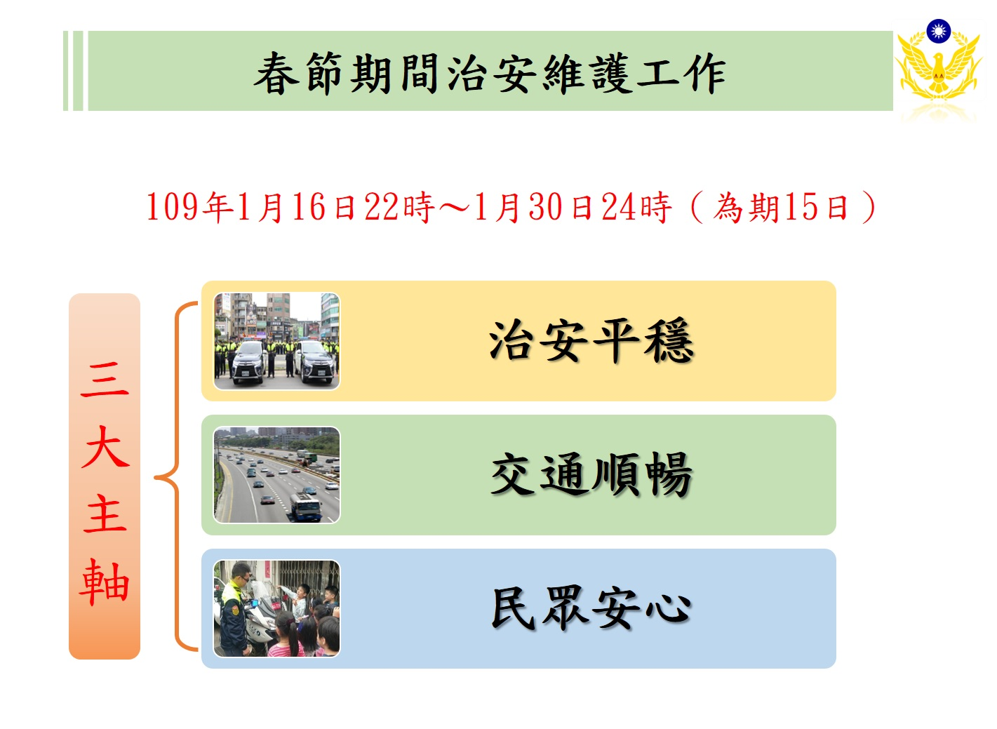 內政部規劃於春節期間(自109年1月16日22時至1月30日24時,共15日),辦理加強重要節日安全維護,以「治安平穩、交通順暢、民眾安心」為工作主軸,透過治安、交通及為民服務作為,讓民眾平安過好年。