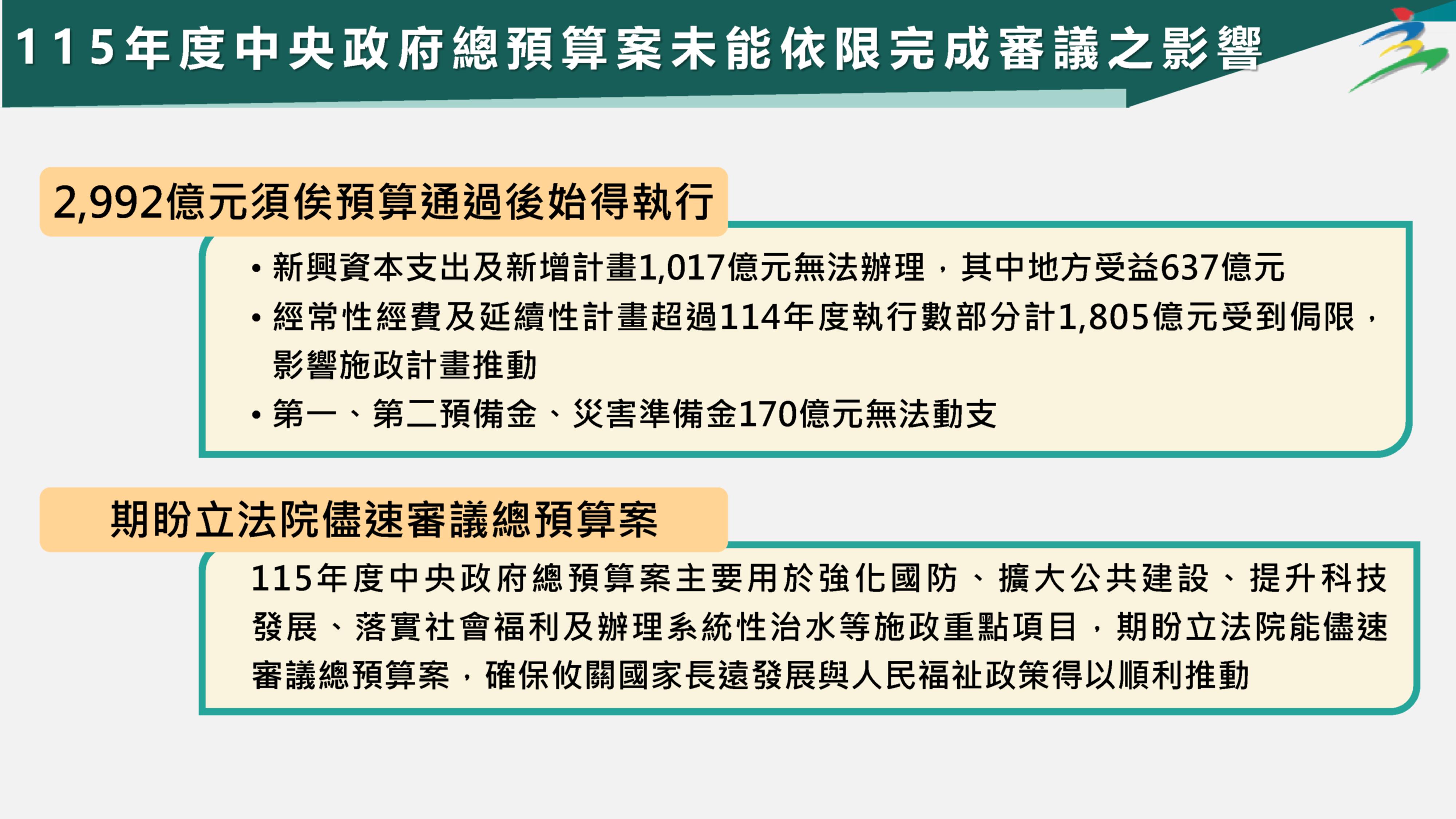 二、鑒於上開不得動支數2,992億元均與國家發展、照顧國人民生利益攸關,希望立法院儘速審議115年度中央政府總預算案,使各項關乎國家長遠發展與人民福祉政策得以如期施行。