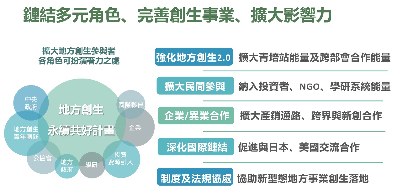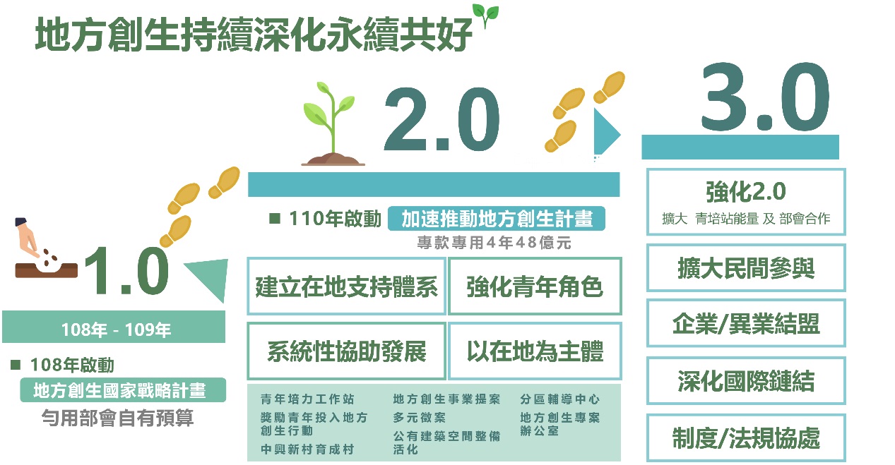 面對我國總人口減少、人口過度集中大都市,以及城鄉發展失衡等問題,自2019年起,政府積極推動地方創生政策,持續透過成各地立青年培力工作站、建立多元徵案管道、媒合中央部會資源與引導民間投資,大力支持在地青年扎根及共好事業落實。