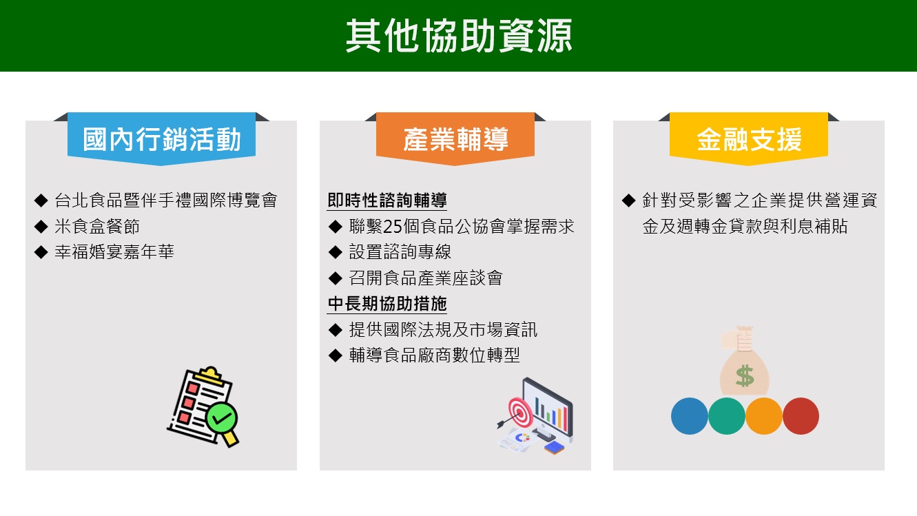 (三)針對受影響企業提供金融支援,包括舊有貸款展延、營運資金及振興資金貸款及利息減免補貼。