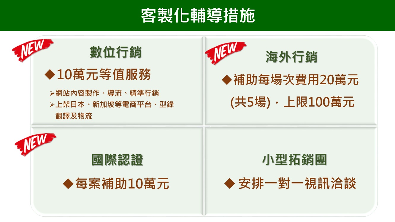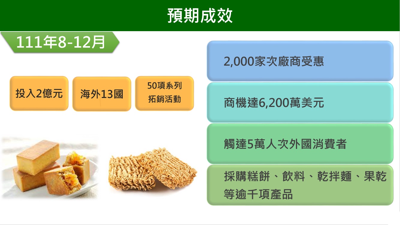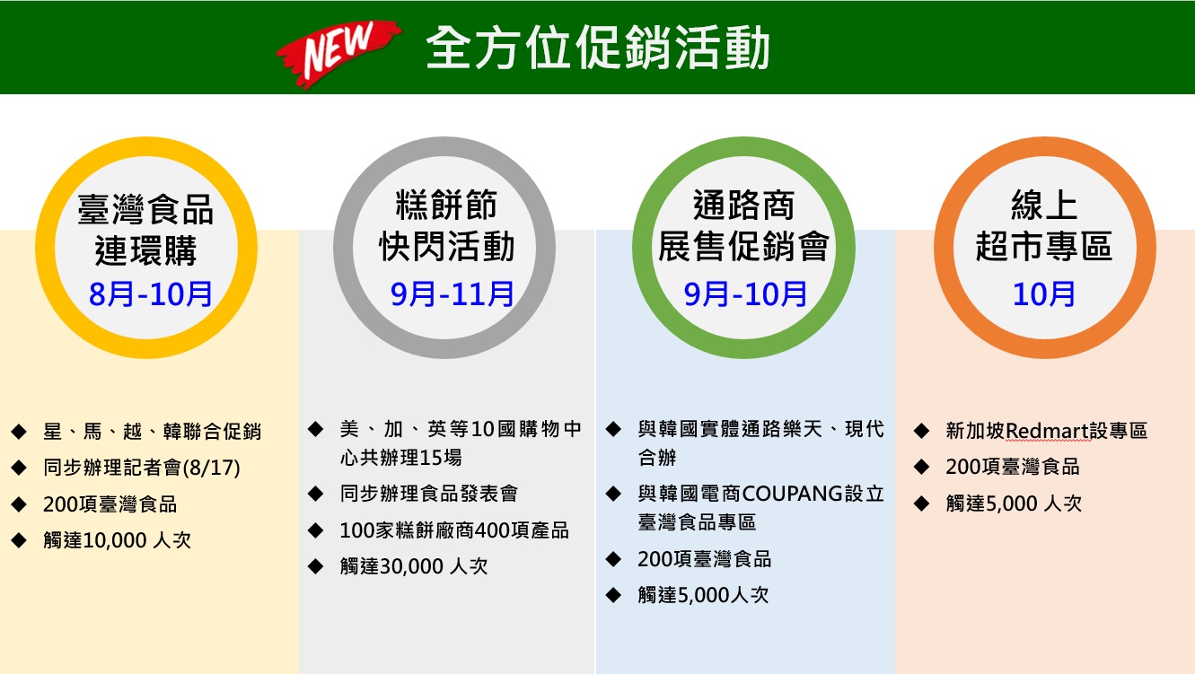 (一)提供客製化輔導措施(如補助業者辦理海外通路促銷活動及數位行銷費用)、海外大型促銷活動(如在全球市場購物中心辦理臺灣食品連環購、快閃活動、展售促銷會)、籌組海外展團及食品通路商採購大會。