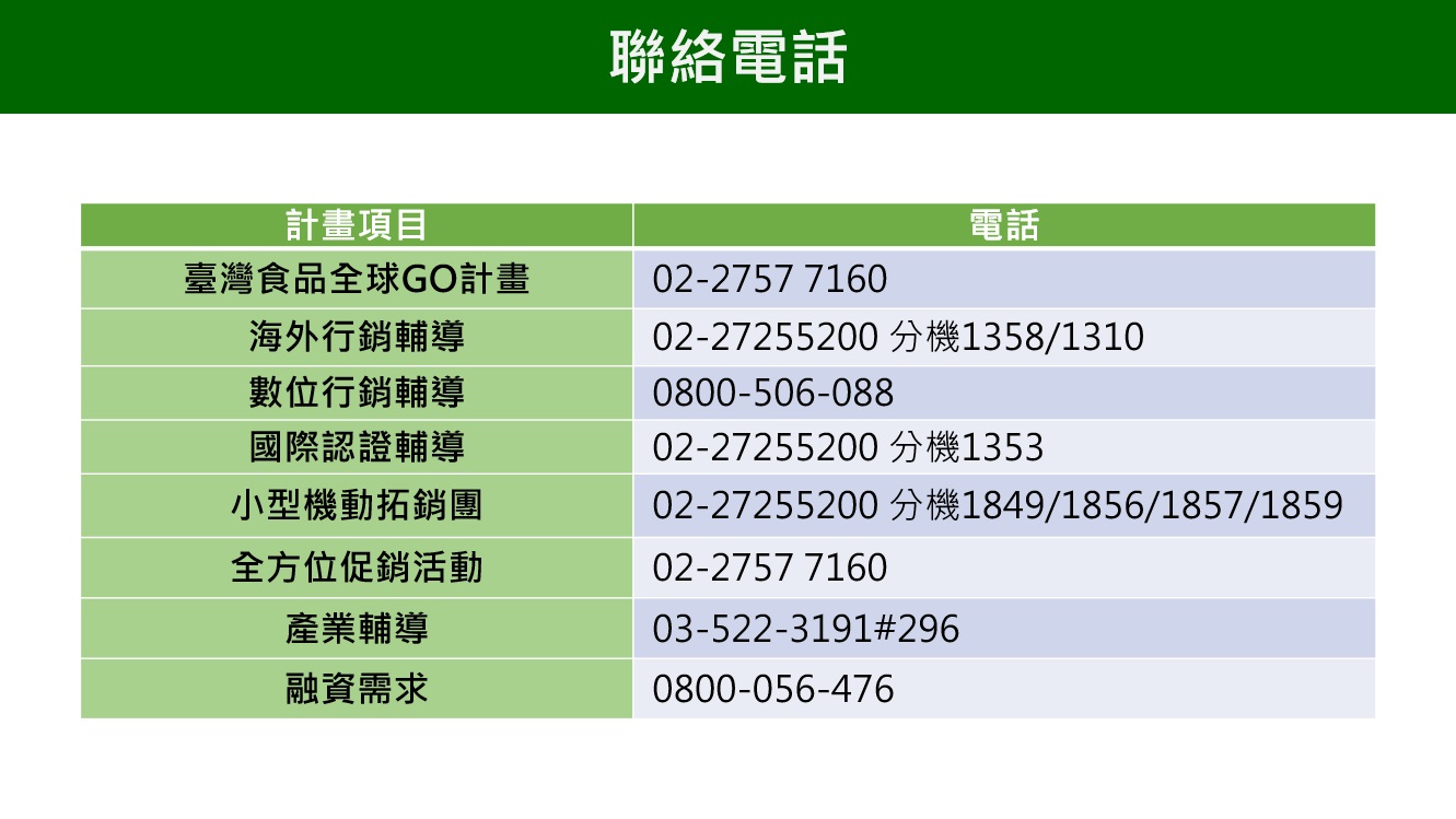 經濟部已設置諮詢專線提供即時性諮詢服務,加工食品業者如有拓銷、輔導與資金的需求,可聯繫下列單位: