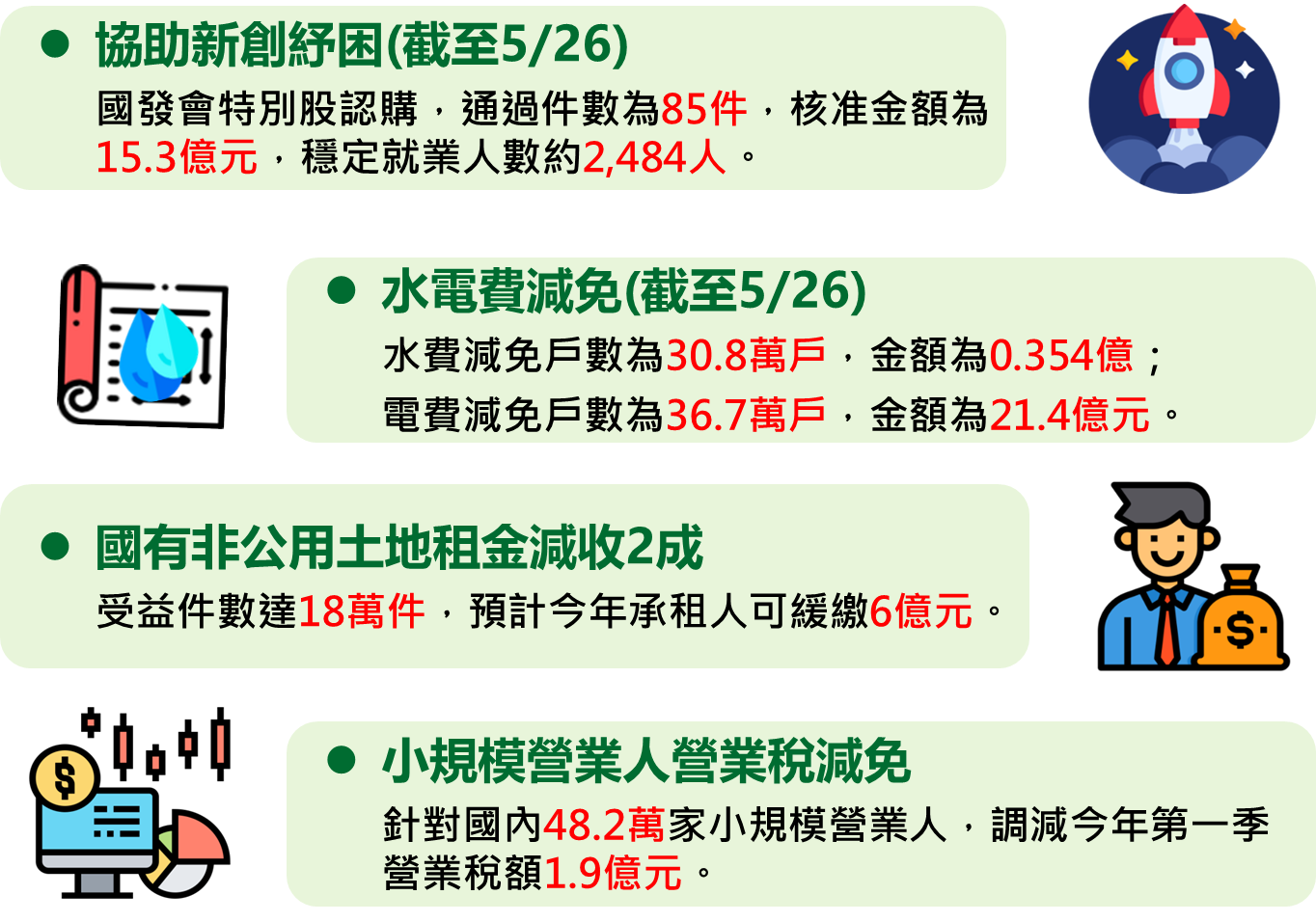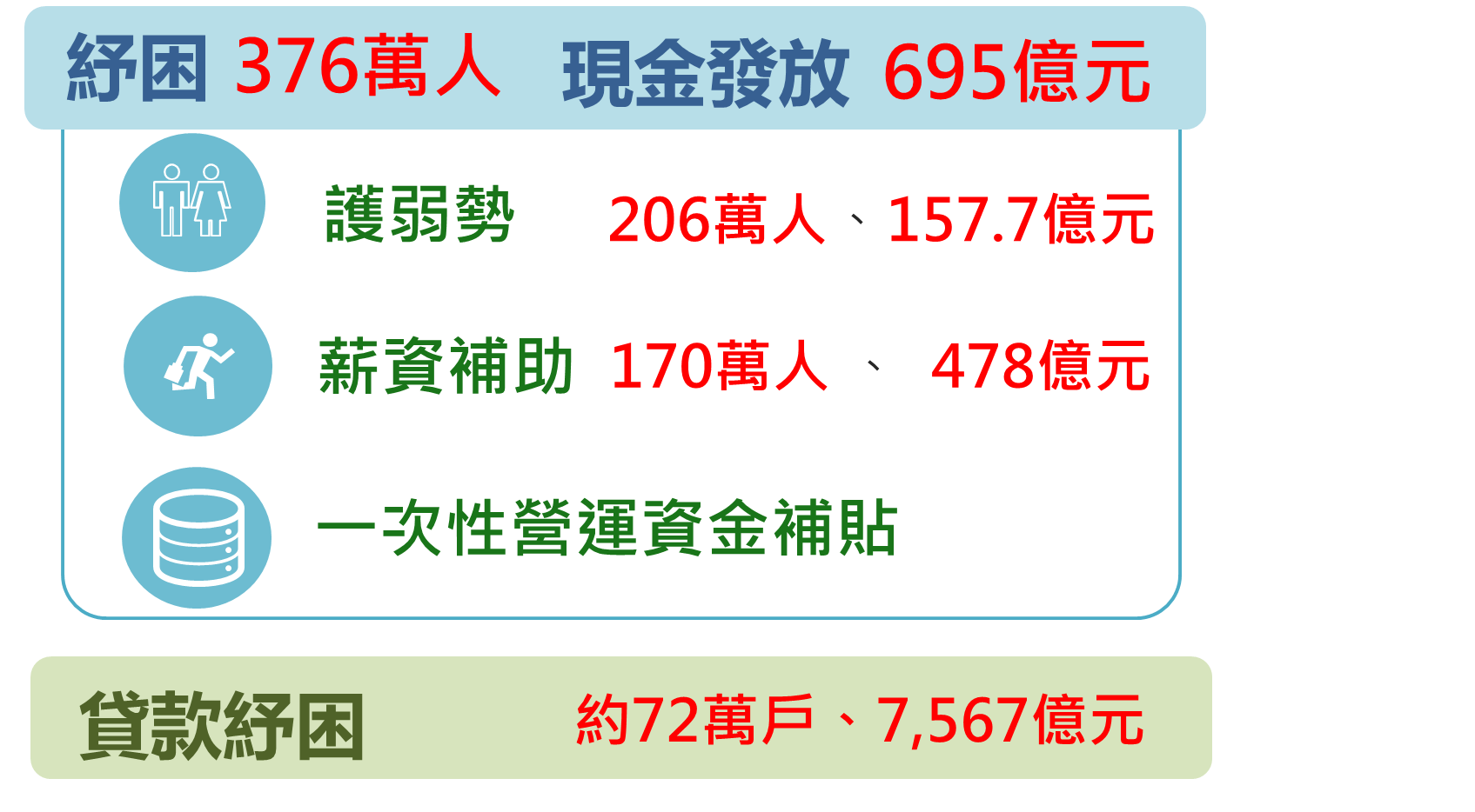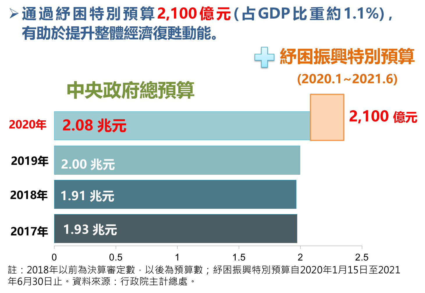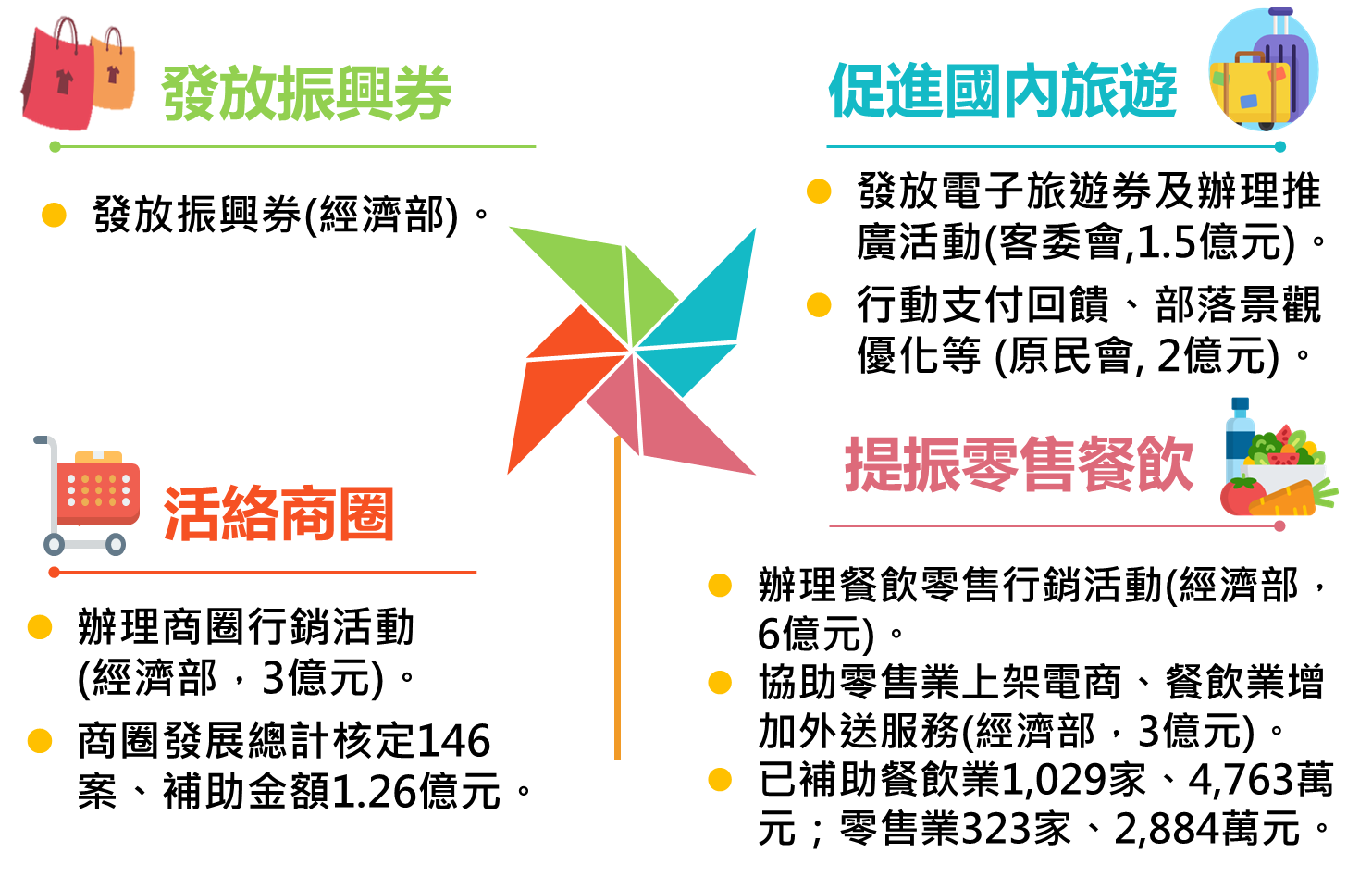 行政院院會今(28)日由國家發展委員會報告「後疫情時代臺灣總體經濟發展(含現階段紓困結果)」,因應新型冠狀病毒疫情對國內經濟的衝擊,政府推出「穩住就業」、「協助弱勢」及金融協助等紓困措施,目前已經展現階段性成果。下一階段,各部會將全力振興經濟,陸續推出刺激國內消費、帶動旅遊、活絡商圈等措施;也會針對擴大內需的政策,包括加速公共建設、歡迎台商回台投資行動方案,努力落實,力拼經濟穩定成長。