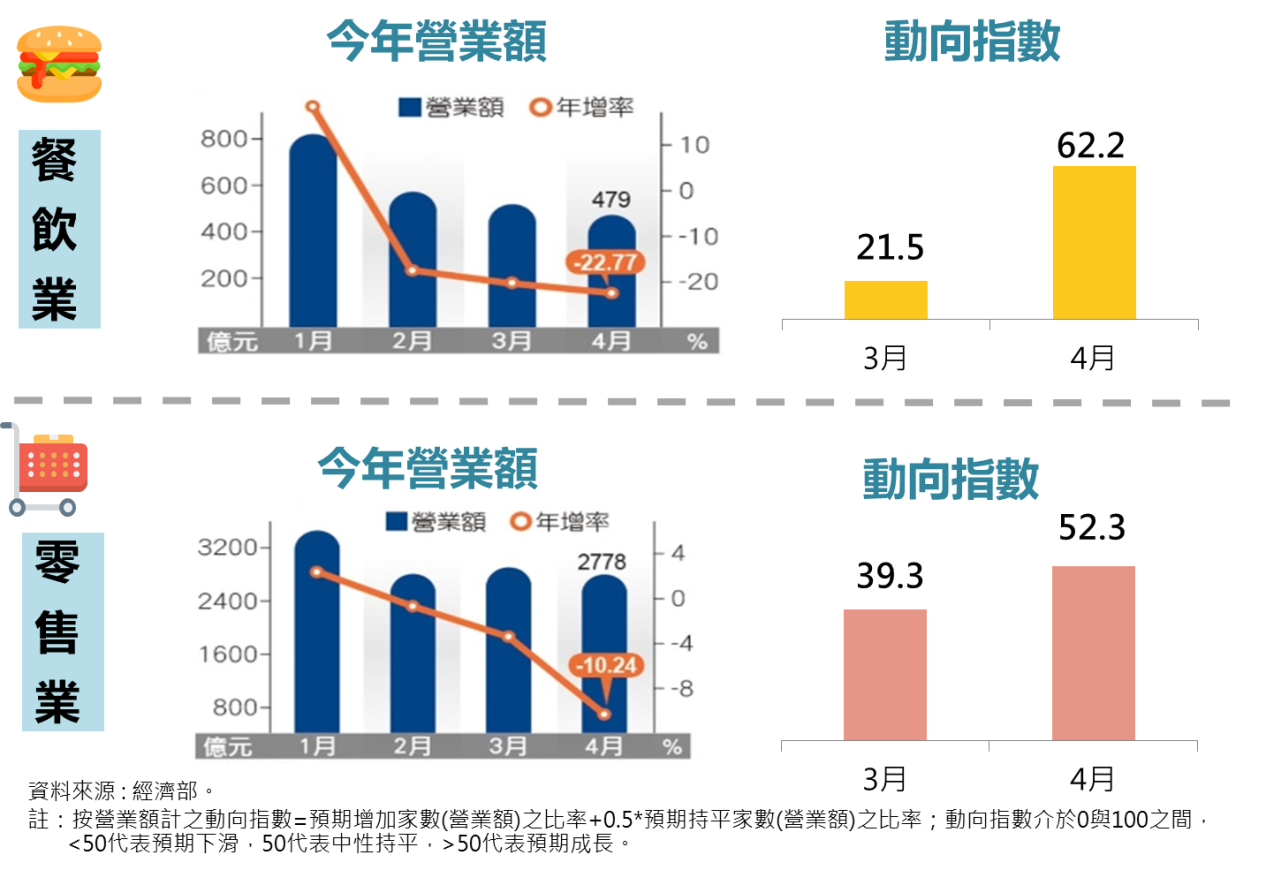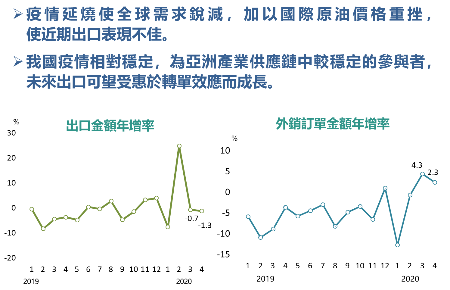 隨著國內疫情趨緩,零售及餐飲業等服務業表現,5月下旬逐步改善,預期未來民間消費回溫;製造業部份,雖然受到歐美市場疫情影響而需求趨緩,影響我國部份產業出口成績,然而因遠距應用產品需求激增,我國電子零組件業生產持續成長,有助支持整體表現。政府刻正籌備刺激國內消費、活絡商圈等振興措施;並加速推動投資臺灣三大方案、提升公共建設執行率等,力拚經濟動能增加、就業市場穩定。