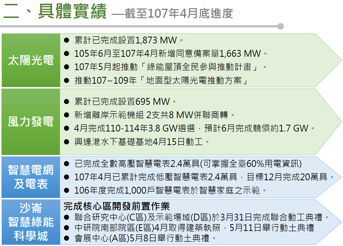 為加速再生能源發展,經濟部亦積極推動儲能系統與智慧電網,以提升再生能源併網容量並強化電力系統穩定功能。在智慧電表布建上,截至107年4月底為止已完成2.4萬具低壓智慧電表之設置,並預計於9月累計完成20萬具。為了進一步強化綠能科技研發以及產學研之鏈結,位於台南的沙崙智慧綠能科學城亦於107年3月31日正式動工,未來將成為我國綠能科技產業網絡中心及連結國際的重要據點。