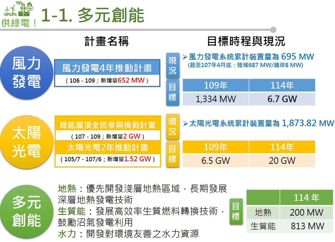 經濟部指出,我國現階段再生能源之建設進度穩健樂觀,預計114年風力發電總裝置量目標為6.7GW、太陽光電20GW。截至107年4月底為止,風力發電系統累計裝置容量為695MW、太陽光電系統累計裝置容量為1.87GW,均已超過原訂目標,相關內需帶動產業亦有初步具體成果。