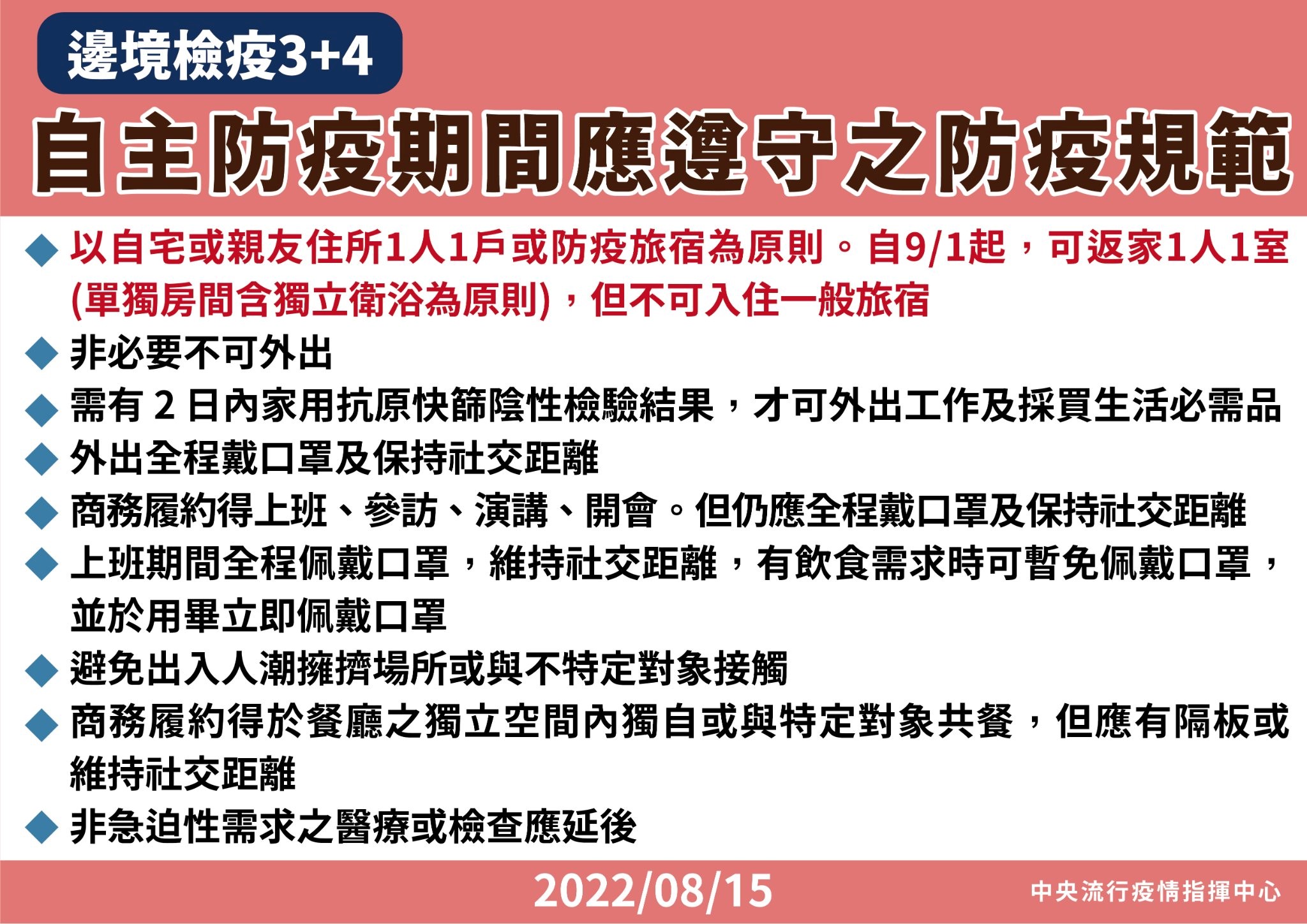 四、入境後自主防疫期間可1人1室:為持續促進社會經濟發展及兼顧民眾生活需求,經綜合評估入境檢疫措施實施情形、國內疫情、防疫與醫療量能,自本年9月1日起,入境檢疫措施維持3天居家檢疫及4天自主防疫,後4天自主防疫調整為「1人1室」,說明如下: