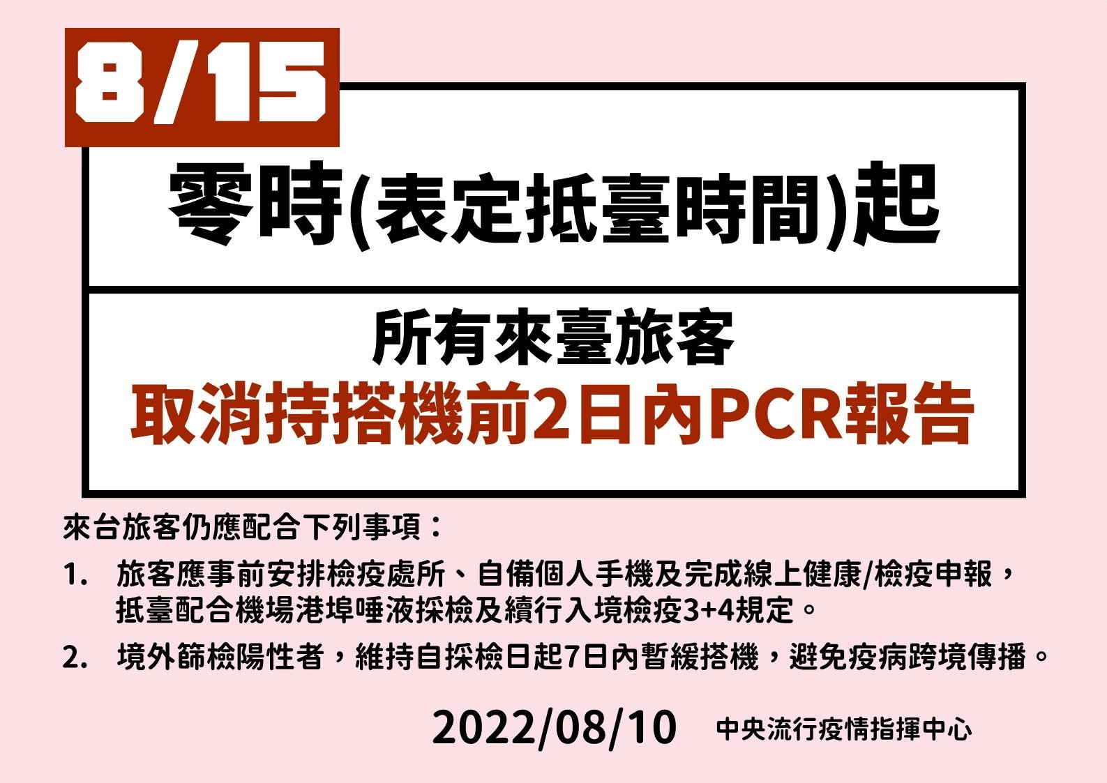 一、取消來臺搭機前PCR報告:因應各國邊境管制政策已逐步開放,經評估國際間多數國家已免除旅客搭機前檢驗報告規定,並考量現行我國仍維持入境機場唾液PCR檢測及「入境檢疫3+4」(3天居家檢疫及4天自主防疫)等措施,可於邊境進行防疫,故自本(111)年8月15日零時起,取消所有來臺旅客搭機前持2日內PCR報告;惟境外篩檢COVID-19陽性者,仍維持自採檢日起7日內暫緩搭機,避免疫病跨境傳播。