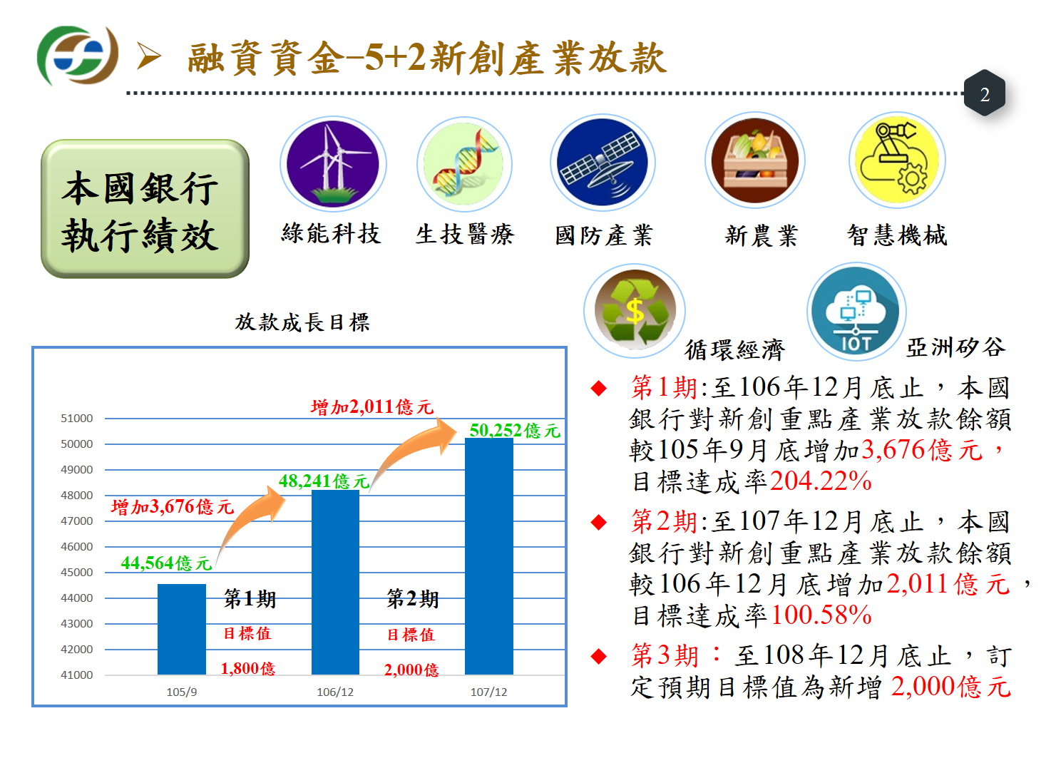 (二)賡續推動「獎勵本國銀行辦理新創重點產業放款方案」及「獎勵本國銀行加強辦理於新南向政策目標國家授信方案」,鼓勵銀行在兼顧風險控管下,對5+2新創產業及新南向相關產業,在融資方面提供必要的營運資金。截至107年12月底,對新創重點產業放款餘額5兆252億元;至108年4月底對新南向國家授信總額1兆1,096億元。