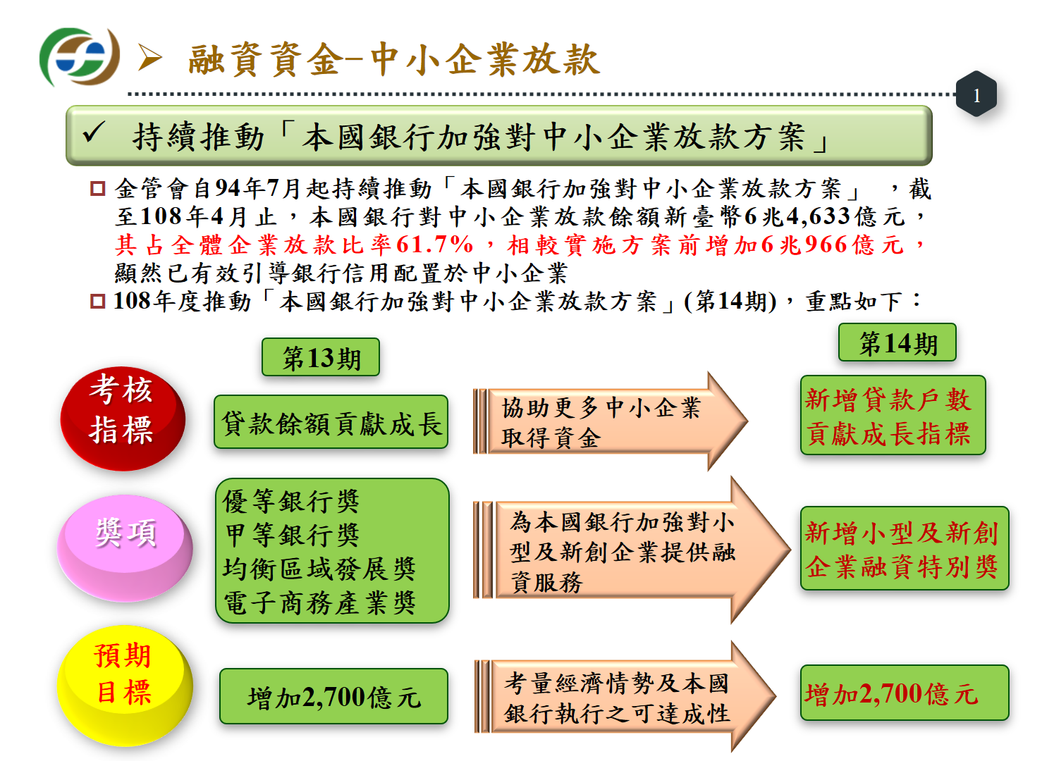 (一)金管會持續推行「本國銀行加強辦理中小企業放款方案」,截至108年4月底,放款餘額新臺幣(以下同) 6兆4,633億元、占全體企業放款比率61.7%,今(108)年並新增「貸款戶數成長」為考核指標,以協助更多中小企業取得資金,及新增「小型及新創企業融資特別獎」,期使本國銀行加強對小型及新創企業提供融資服務。