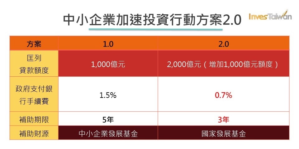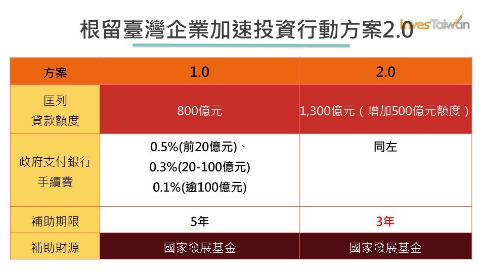 由於廠商申請情況十分熱烈,「根留臺灣企業加速投資行動方案」(根留方案)及「中小企業加速投資行動方案」(中小方案)貸款額度已於今(110)年3月提前用罄,排隊待審廠商尚有50多家,經濟部爰將根留方案貸款額度自800億元調高為1,300億元,中小方案貸款額度自1,000億元調高為2,000億元,兩方案總計調升1,500億元額度,期望在三大方案最後半年施行期間,加速協助申請廠商安心投資,朝向產業創新化、智慧化、高值化方向發展。