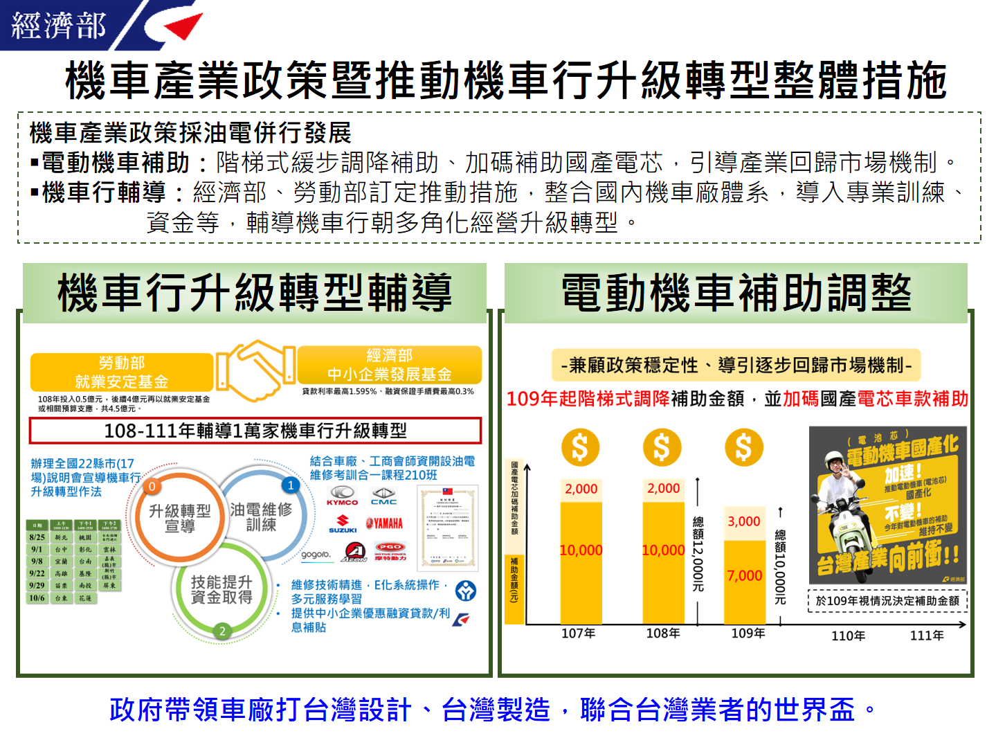 電動機車產業穩健成長,政策將調整補助機制,同時加碼鼓勵使用國產電芯,協助產業回歸市場機制;此外,推動燃油機車與電動機車併行發展,經濟部與勞動部將整合資源,輔導傳統機車行升級轉型,共享電動機車蓬勃發展成果。內容說明如下:
