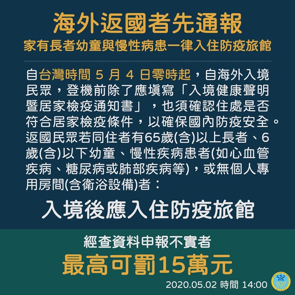 (四) 為確保國內防疫安全,自5月4日起,自海外入境民眾登機前須確認住處是否符合居家檢疫條件,如家中同住者有65歲以上長者、6歲以下幼童、慢性疾病患者或無個人專用房間(含衛浴設備)者,入境後一律入住防疫旅館。