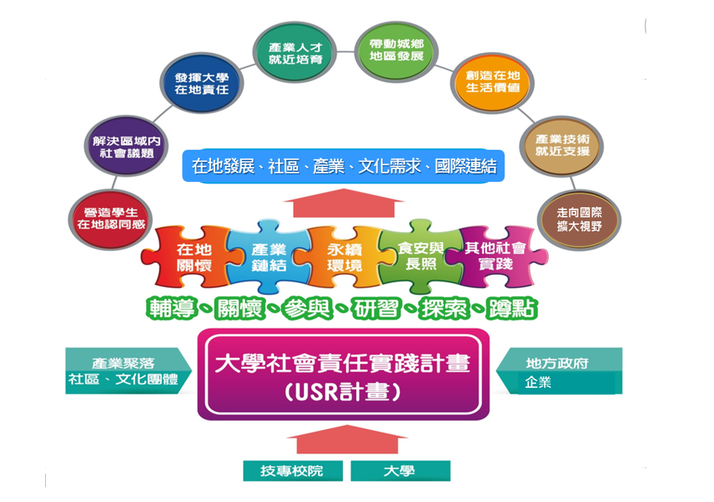 教育部推動USR計畫,引導大學以人為本,從在地需求出發,透過人文關懷與協助解決區域問題,善盡社會責任,期待大學在洞察、詮釋及參與真實問題過程中,整合相關知識、技術與資源,聚焦於區域或在地特色發展所需或未來願景,強化在地連結,吸引人才群聚,促進創新知識的運用與擴散,帶動地方成長動能。計畫推動策略如下: