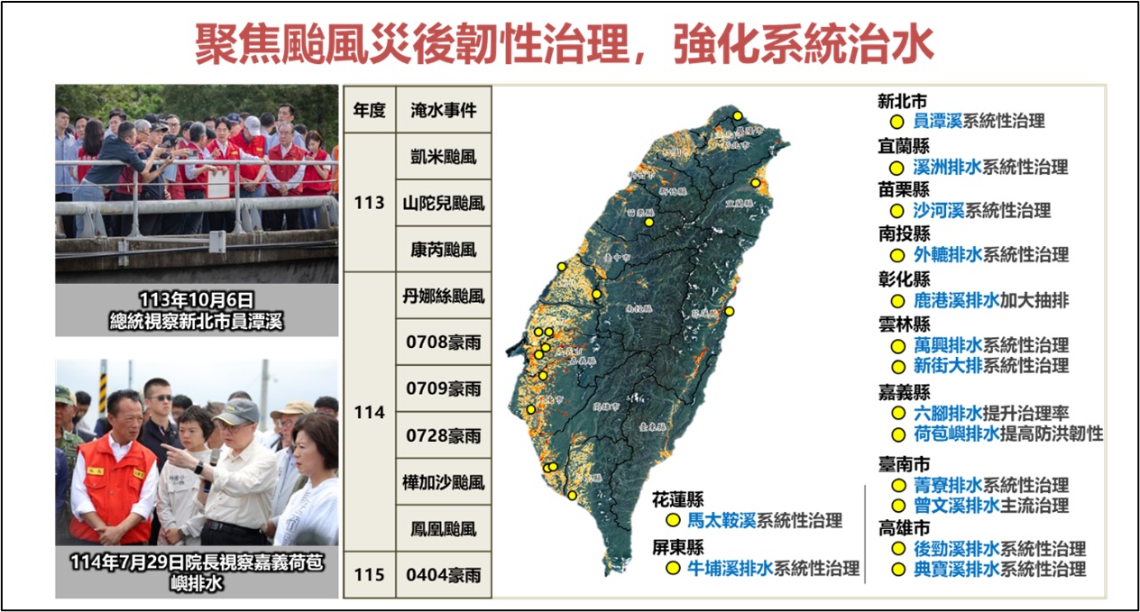 透過部會協調與資源整合,積極辦理各項治水工程,如:113年凱米颱風於大湖口溪發生淹水,立即辦理清疏及堤段加高,使防洪能力達保護標準,降低淹水風險;另過去每逢颱風豪雨易發生高淹水風險地區,如:彰化鹿港排水、高雄典寶溪,在排水加高改善等工程陸續完工後,已展現淹水面積減少、淹水深度降低、退水時間加快等具體淹水改善成效。另114年樺加沙颱風致馬太鞍溪堰塞湖溢流後發生淹水災害,亦即刻執行各項系統性治理,目前已完成光復堤防復建工程等,確保馬太鞍溪通洪能力達防洪標準。