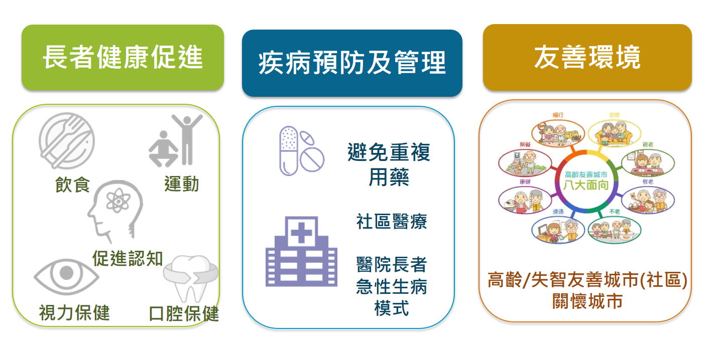 七、創新加值的長者健康照護,推動全人全場域的健康促進,建構智慧健康照護生活圈,發展銀髮科技產業、鏈結各部會服務發展,持續打造高齡友善國家。