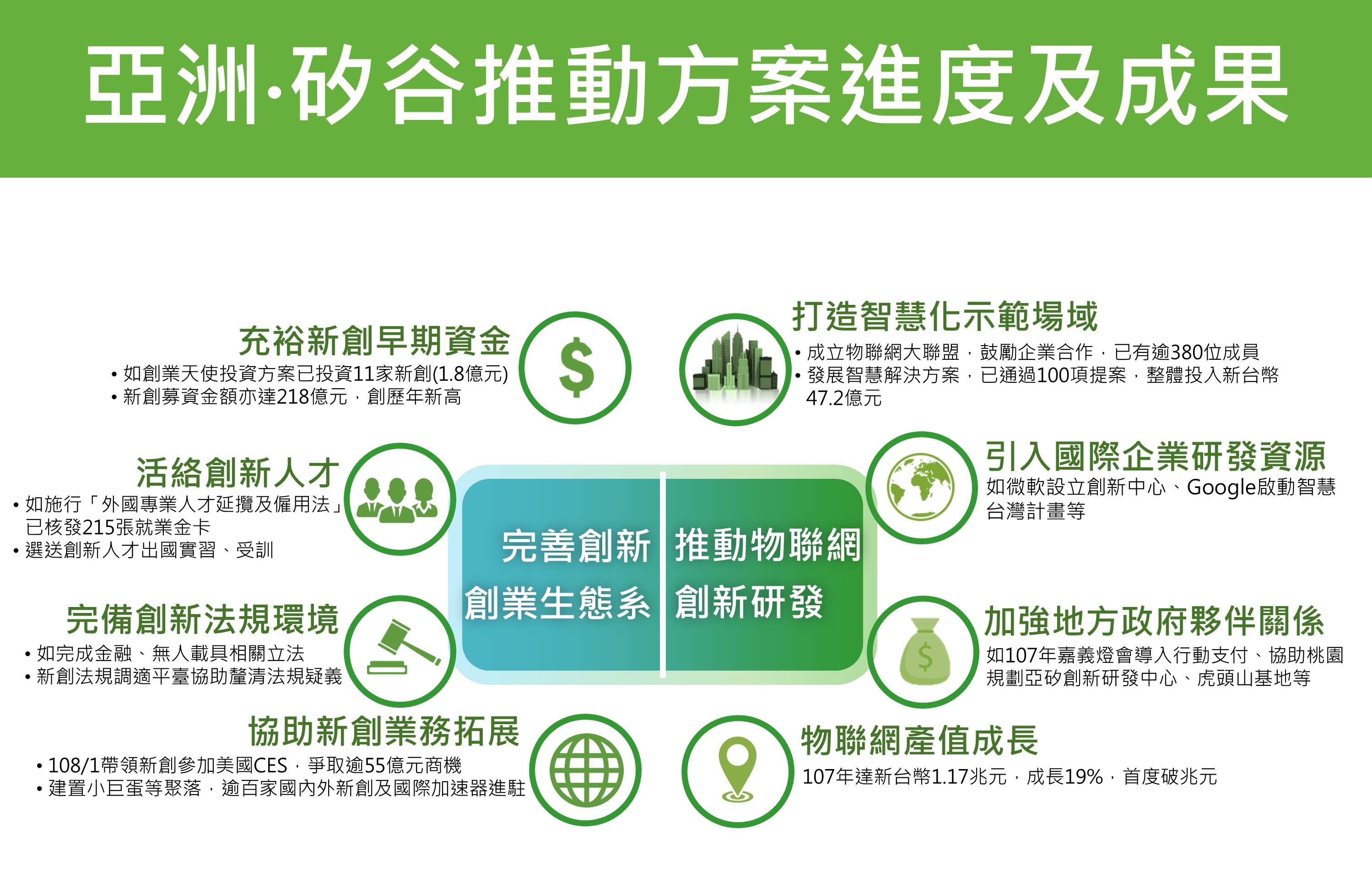行政院於105年9月通過「亞洲·矽谷推動方案」,以「完善創新創業生態系」及「推動物聯網創新研發」2大主軸積極推動,期帶動國內產業從IT到IoT全面轉型升級。在國發會、經濟部、科技部、交通部、教育部等相關部會的共同努力下,亞洲·矽谷推動方案已獲致豐碩成果: