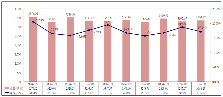 (二)一般公共建設計畫共計222項計畫(延續性計畫205項,108年新增17項),年計畫經費3,364.27億元,截至108年3月底,已執行576.62億元,年分配經費執行率107.92%、年計畫經費達成率17.14%。