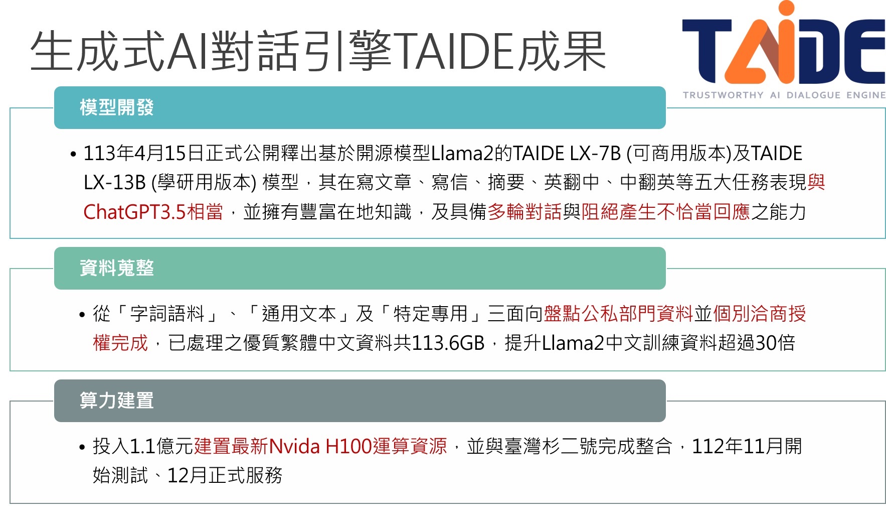 TAIDE開發迄今已獲致初步成果。今(113)年4月15日公開釋出可商用版本(TAIDE LX-7B)及學研用版本(TAIDE LX-13B)的TAIDE模型,係以Meta開源模型Llama 2為基礎,透過蒐整正體中文及在地文本訓練資料開發預訓練模型。兩項模型在寫文章、寫信、摘要、英翻中、中翻英等五大任務表現優異,已可與ChatGPT 3.5相當,並具備多輪對話與阻絕產生不恰當回應之能力。另一方面,因應Meta最新對外釋出的新一代的大型語言模型Llama 3,TAIDE開發團隊另於4月29日對外釋出「升級版」Llama 3-TAIDE-LX-8B-Chat-Alpha1模型,快速回應外界期待。此外,TAIDE團隊亦與產學研夥伴發展多元應用,將TAIDE模型應用在農業知識檢索系統「神農TAIDE」、中小學生臺語教學等共7個領域。
