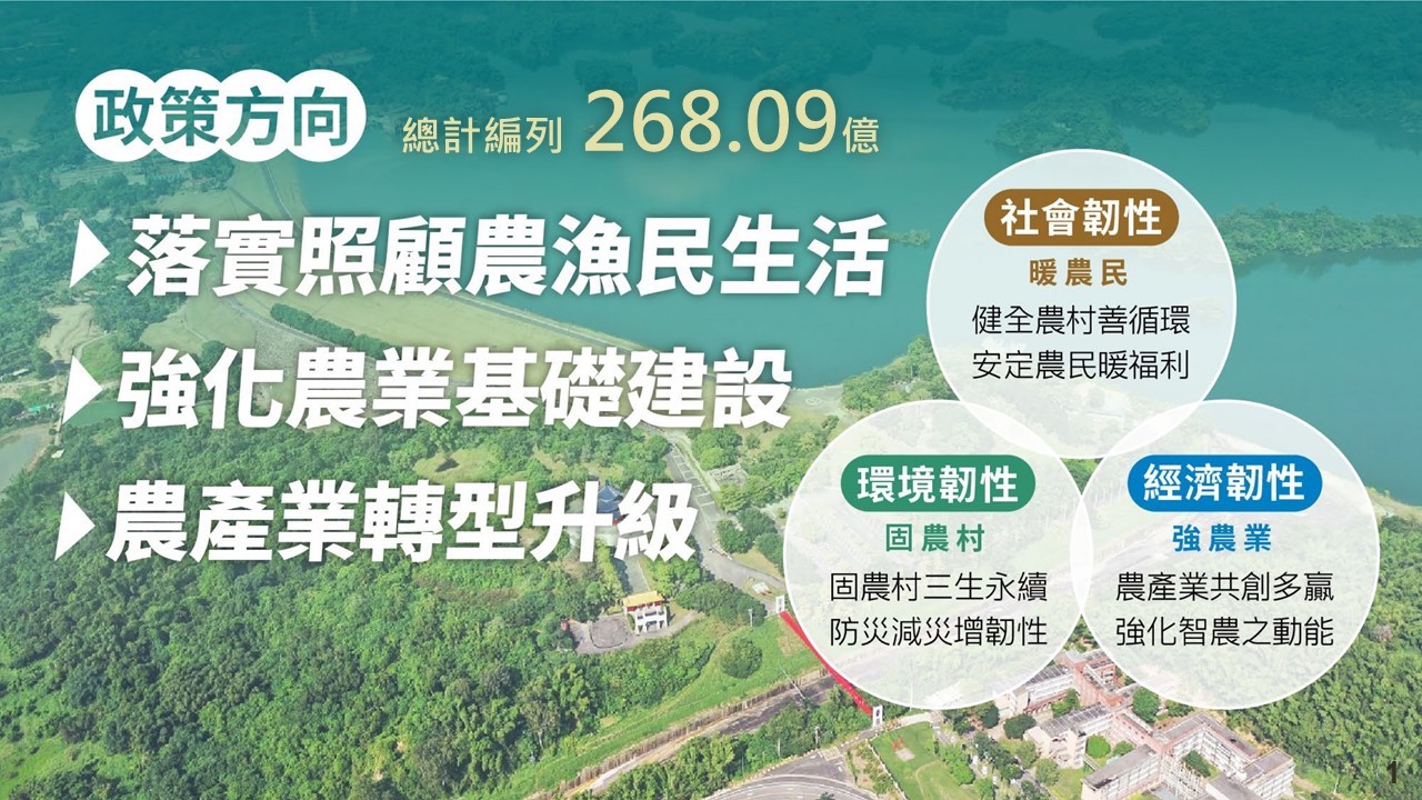 農委會表示,面對百年旱澇考驗,疫後全球政經趨勢詭譎多變,強化農業韌性刻不容緩,該會擘劃農漁民協助措施為強化農產業經濟、農村社會韌性及全民共享經濟成果,加大執行力道營造農業及農村永續環境。同時回應農民第一線問題,溫暖及時、力求解方,提升農民所得、保障安心從農,穩定民生物價、促進農產業轉型升級,共創農村成為宜居宜業宜遊之臺灣新家鄉。
