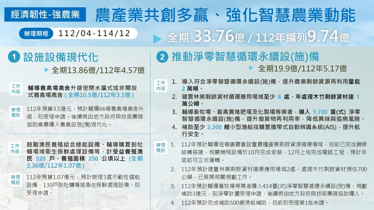 (一)設施設備現代化:輔導養禽場禽舍升級為密閉水簾式或非開放式禽舍;推動養殖結合綠能自發自用,112年預計辦理3處示範性儲能設備、130戶剖牡蠣場域衛生保鮮處理設備,目前受理補助案件申請。