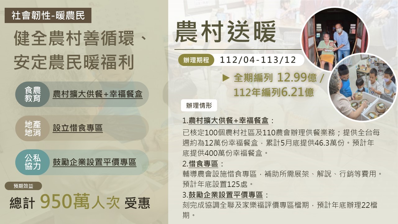 一、社會韌性(農村送暖):希望透過食農教育、地產地消及鼓勵公私協力,達成支持在地農產業,照顧農民及農村高齡或弱勢族群。規劃辦理農村送暖,112年預計執行6.21億元,辦理農村擴大供餐,已受理核定100個農村社區及110農會開辦;幸福餐盒,全台供應每週份數約為12萬份,預計112年全年供應總計400萬份幸福餐盒。設置惜食專區,預計112年輔導125處,已進行輔導100農會超市;鼓勵企業設置平價專區,刻進行協調全聯及家樂福檔期,預計112年辦理22檔期。