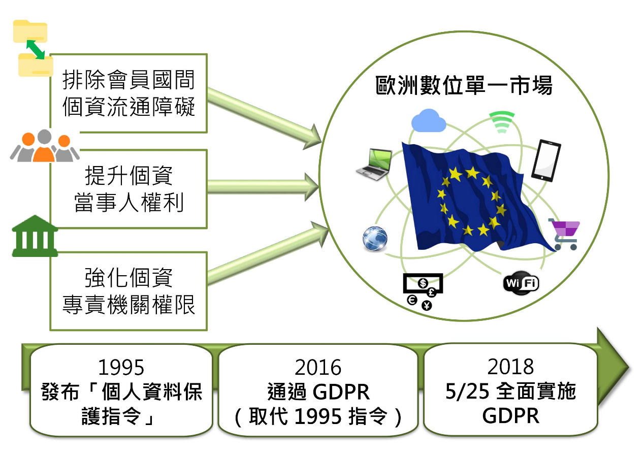 歐盟「一般資料保護規則」(General Data Protection Regulation, GDPR)將自今(107)年5月25日生效,由於此次GDPR規範擴大了適用範圍,除了在歐盟境內設立據點之企業外,還包括對歐盟境內人民提供產品、服務或監測歐盟境內人民網路行為之境外企業,因此GDPR之施行勢將增加我國與歐盟有貿易往來企業之遵法成本,政府將持續關注相關發展並妥為因應。