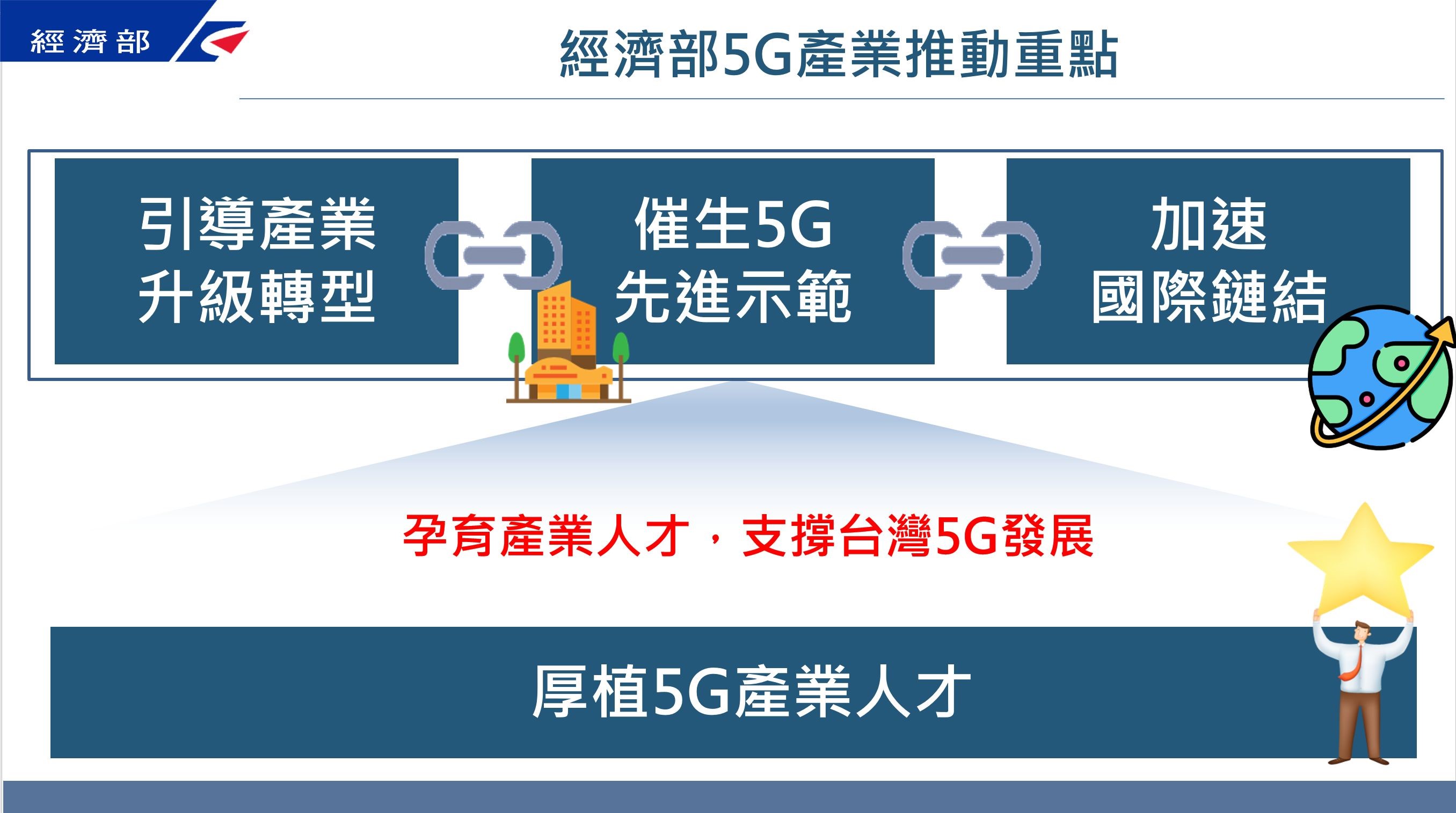 為協助我國網通廠商爭取國際5G商機,經濟部以「人才培育」、「研發補助」、「驗測平台」及「落地實施」等四大推動面向,藉我國堅實的通訊產業生態系為基礎,擴大在5G前瞻技術與應用上的布局,並加速我國產業導入5G智慧應用、進行產業升級轉型之步調。