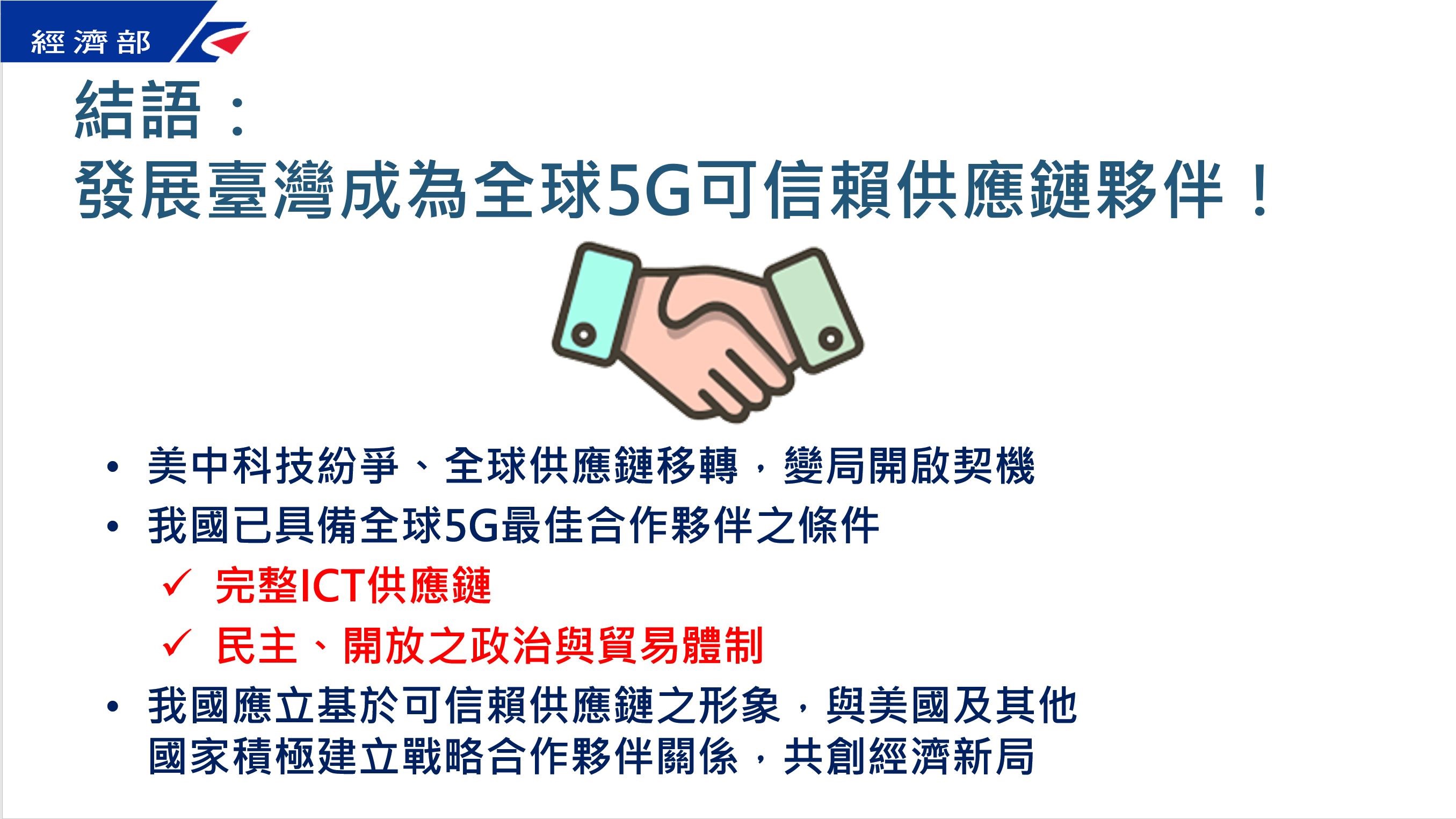 此外,我國資通訊產業長期以來即為國際網路設備大廠合作夥伴,我國可藉在網通設備製造之豐富經驗,及在國際網通供應鏈上扮演之關鍵角色,發展成為可被全球各國信賴、安全的合作對象。政府也將持續支持產業爭取國際商機,共建具韌性的全球5G供應鏈夥伴關係。