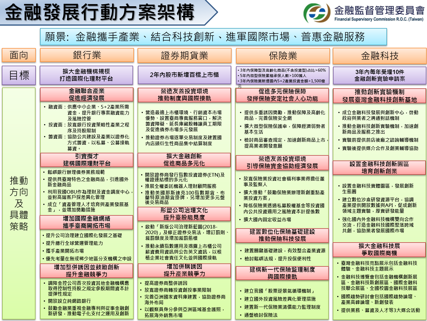 二、金管會提出「金融發展行動方案」,從協助經濟發展與人口高齡化等角度出發,針對「銀行業」、「證券期貨業」、「保險業」及「金融科技」等4大面向,擬定下列未來目標及具體策略,以期達到「金融攜手產業、結合科技創新、進軍國際市場、普惠金融服務」之願景: