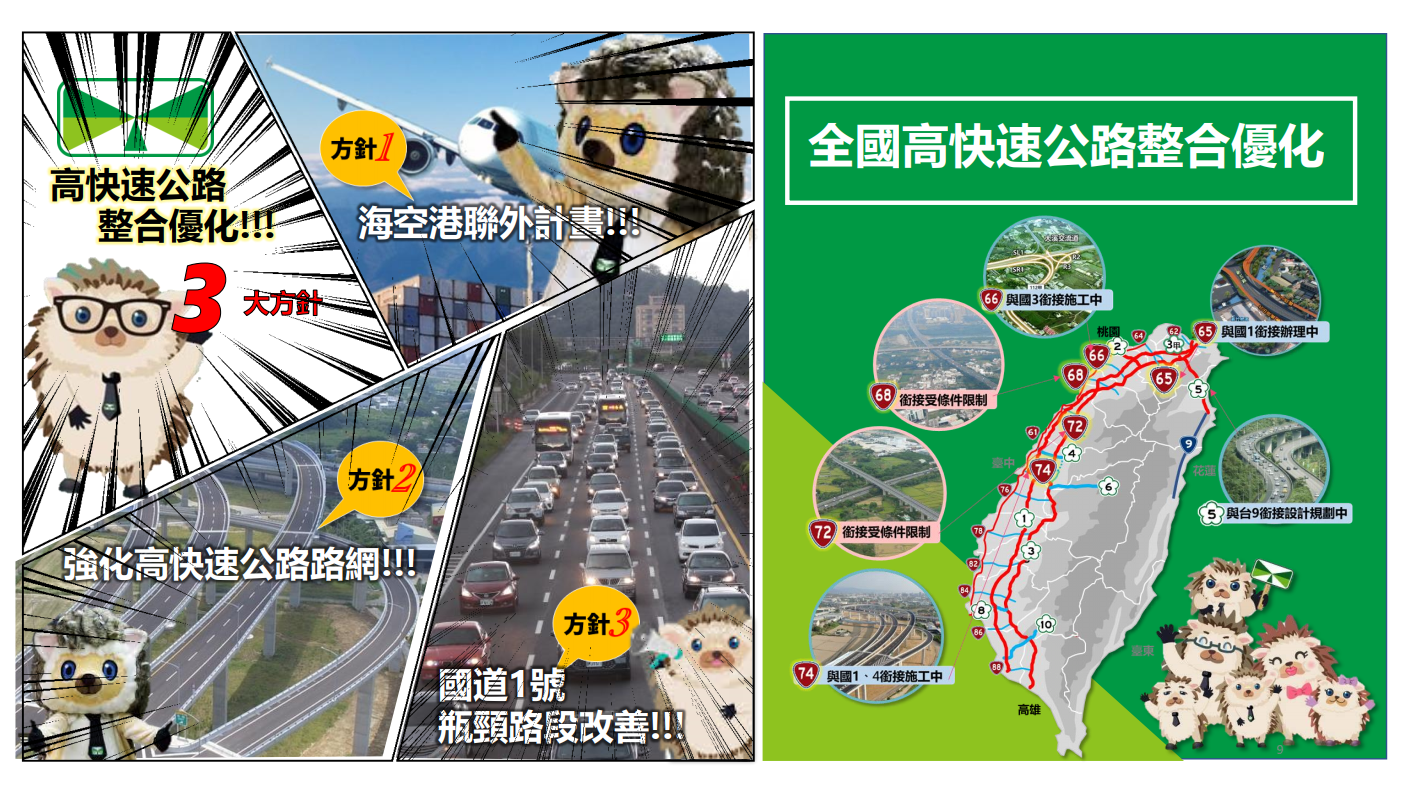 二、強化高快速公路網的連接,辦理國1銜接台65、國1銜接台74、國3銜接台66、國4豐原潭子段銜接台74、國5銜接台9蘇花公路計畫。