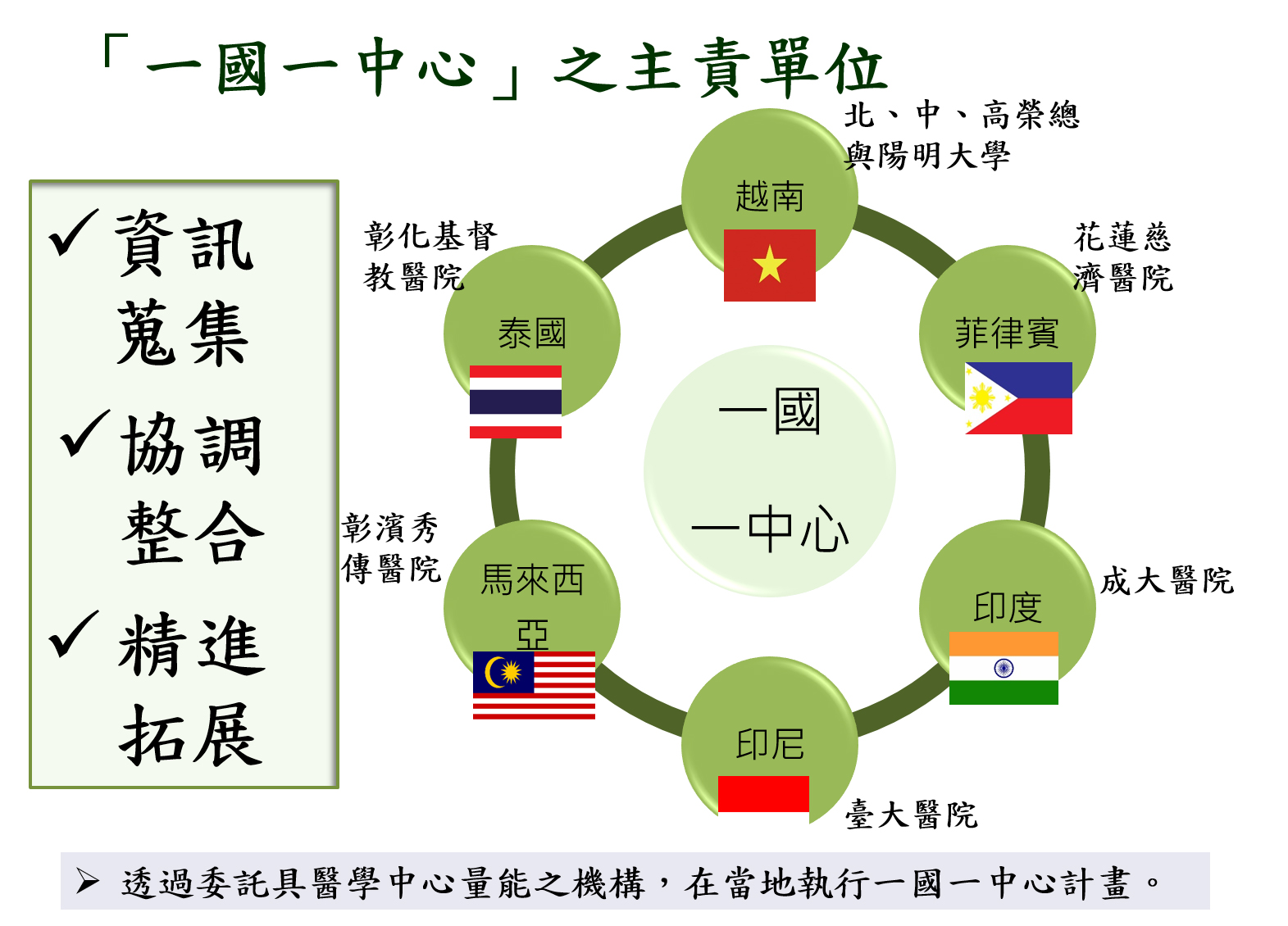 一、 藉由我國醫療衛生軟實力,深耕醫衛人脈網絡,擴大我國在新南向國家的影響力。