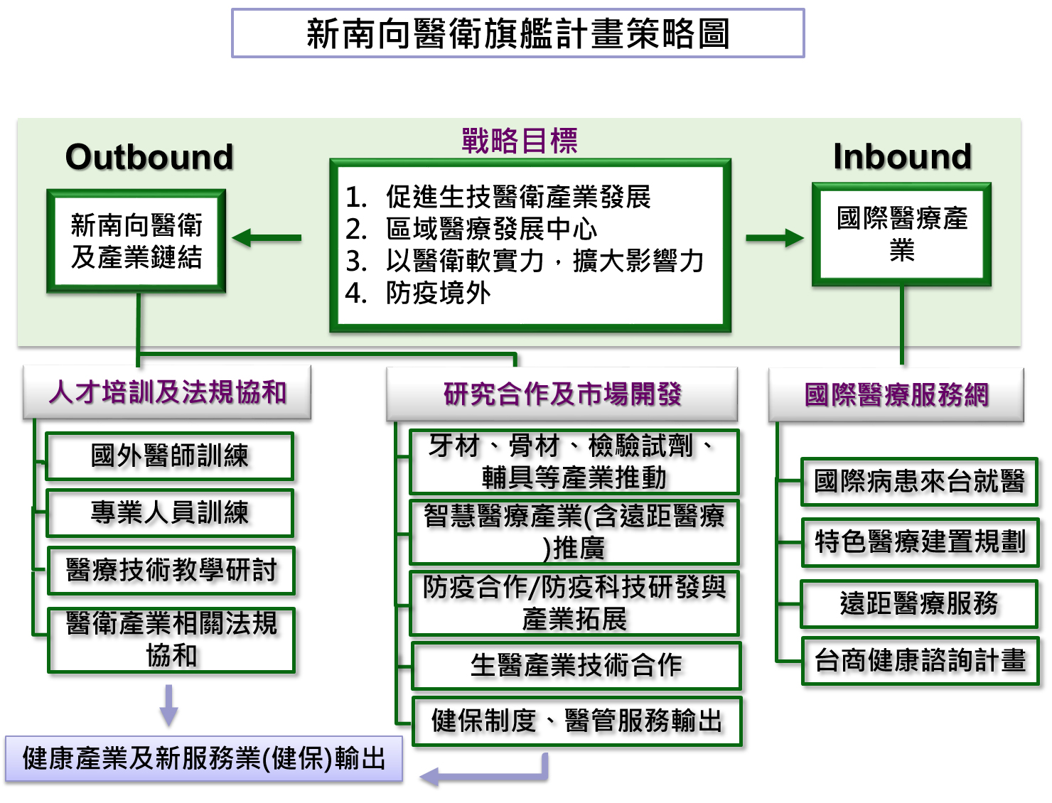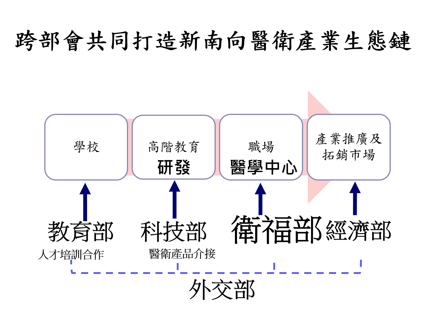 我國105年起推動新南向政策,鑒於我國醫衛成就享譽國際,醫衛是其中重要一環,106年並將「新南向醫衛合作與產業鏈結」選定為新南向五大旗艦計畫之一。