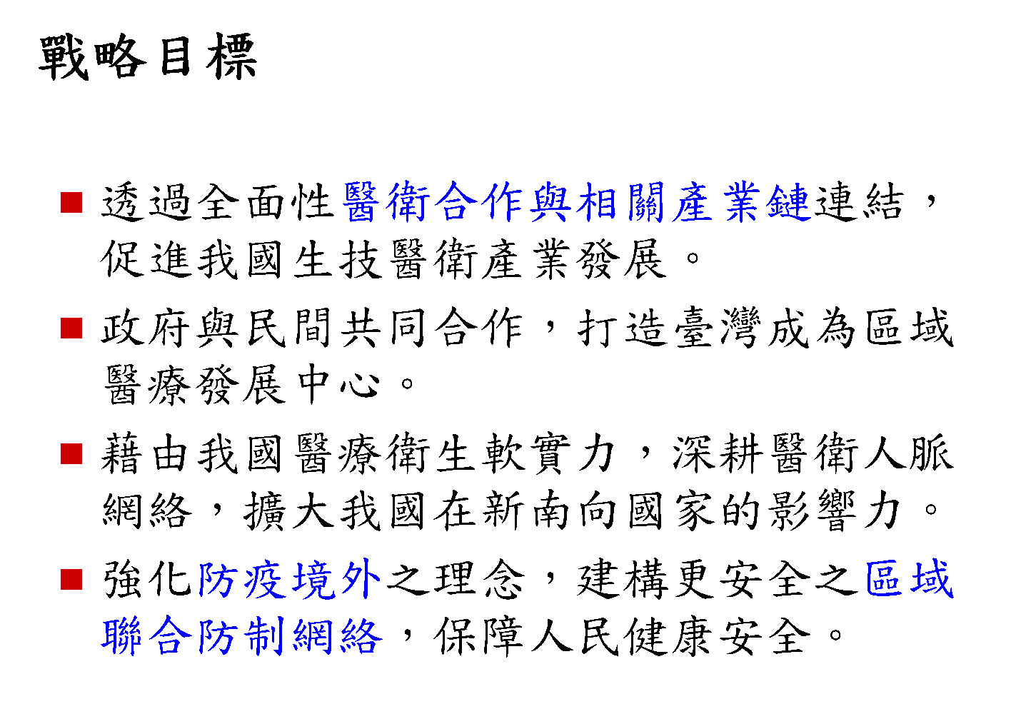 三、 強化防疫境外之理念,建構更安全之區域聯合防制網絡,保障人民健康安全。