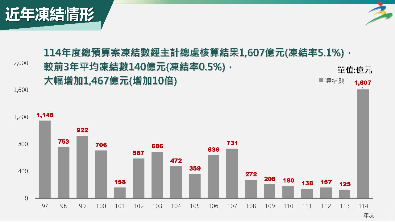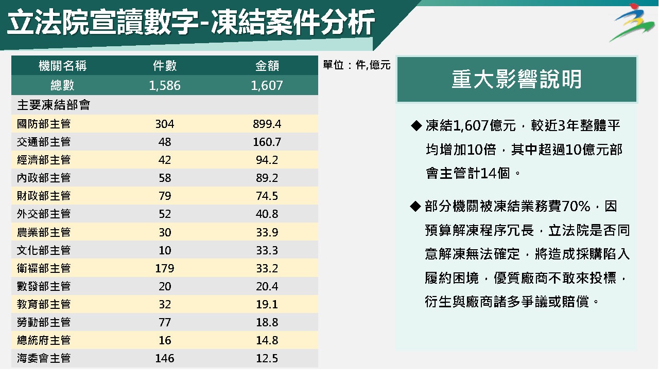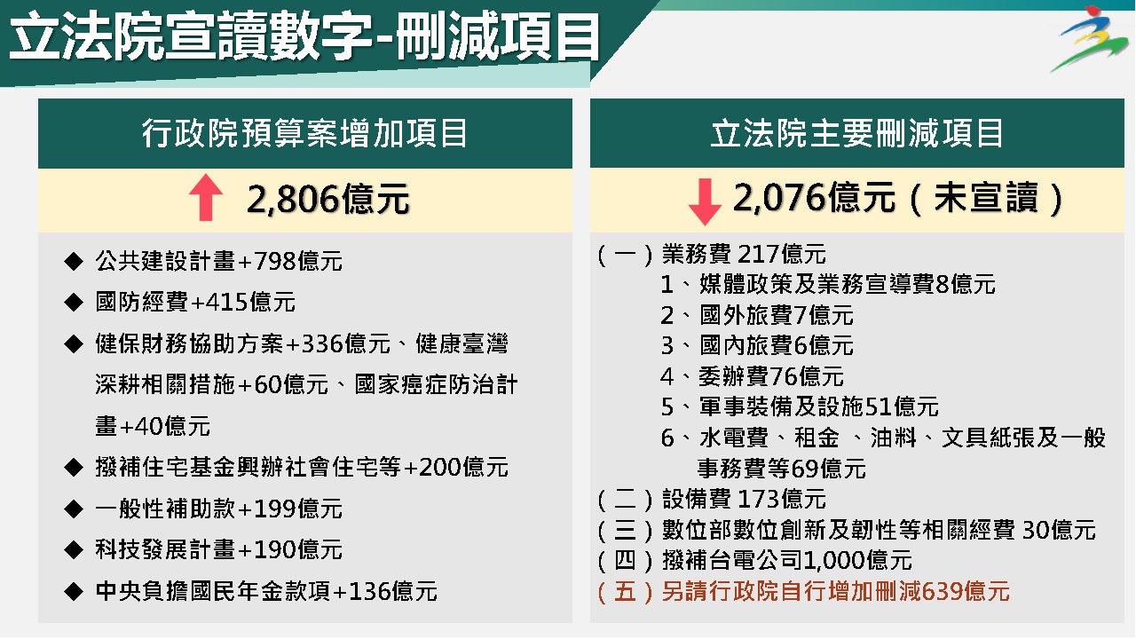 本次立法院刪除的預算明顯集中在某些特定項目及機關,其中國外旅費、特別費、媒體政策及業務宣導費均刪減60%,甚至更高;又監察院及本院業務費分別大幅刪減96.5%及46%,已嚴重影響機關基本運作維持;另經濟部刪減1,037億元,國防部刪減84億元、凍結900億元,數發部刪減36億元,內政部刪減30億元,文化部刪減11億元,都已造成各項業務推動窒礙難行。