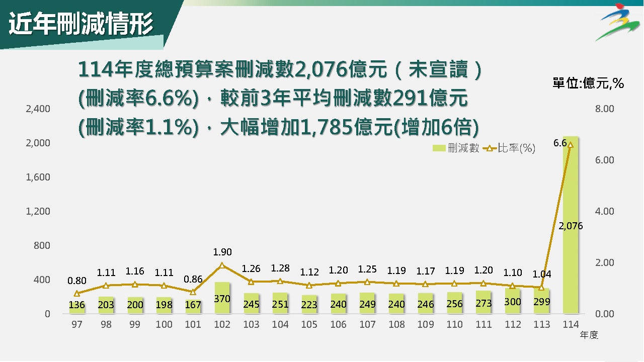 114年度中央政府總預算案經立法院宣讀內容,歲出部分關於通案刪減,各委員審查及院會表決最後總刪減數計算方式各有出入,仍有爭議,有待釐清。