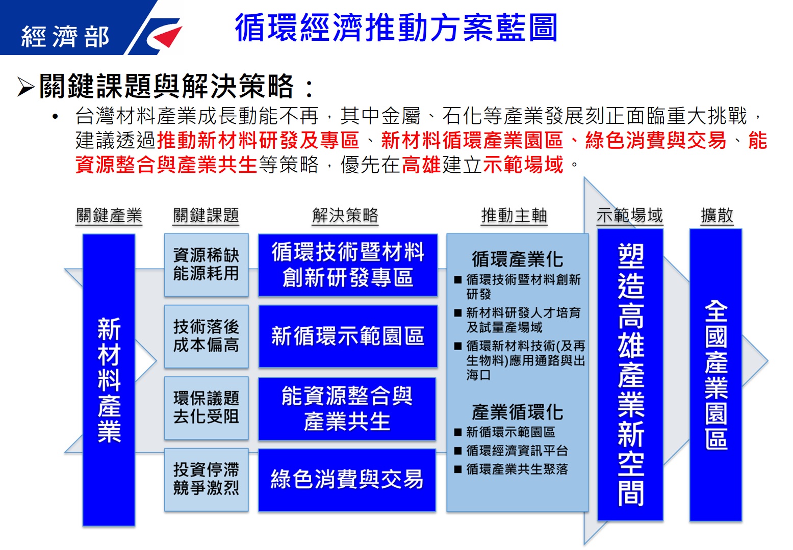 1.循環經濟推動方案以「循環產業化」、「產業循環化」為主要推動主軸,藉由協助關鍵產業(如金屬、石化等材料產業)研發創新材料技術及推動再生資源高值化,同時運用產官學研能量,建構並落實新循環示範園區,並將其整合及規劃之經驗推廣至企業、產業、既有產業園區、地區及國際輸出。