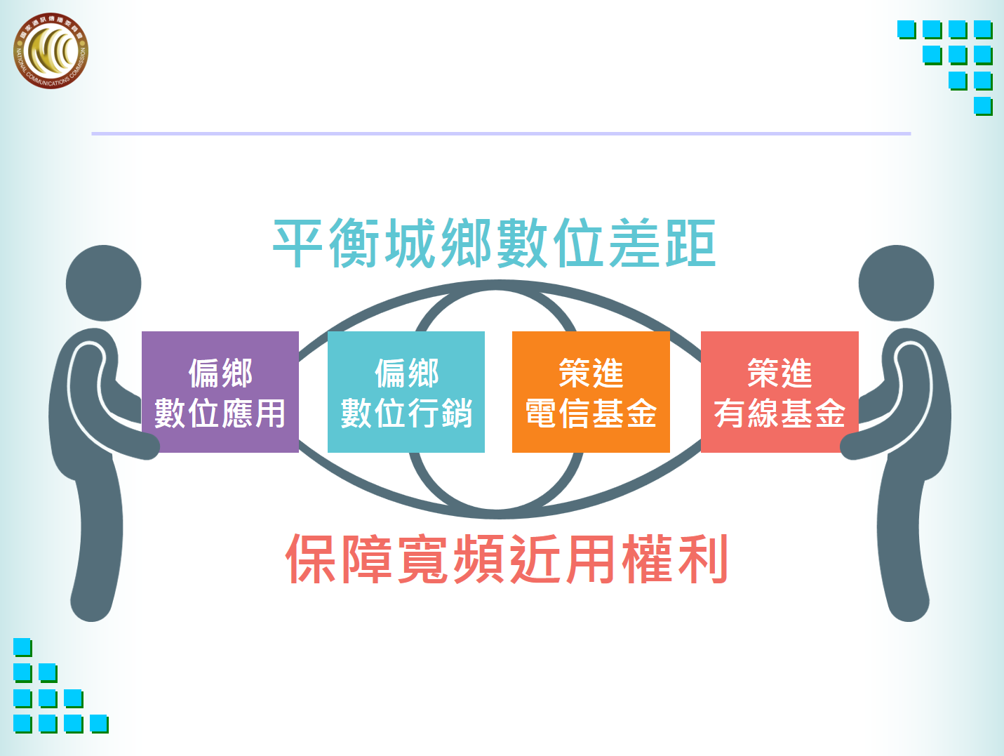 (一) 持續推動通訊傳播普及服務,使偏鄉居民也可以公平合理價格利用網路零時差、零距離暢遊網路世界,享受高畫質、甚或超高畫質匯流影音服務,落實平衡城鄉數位差距的目標。