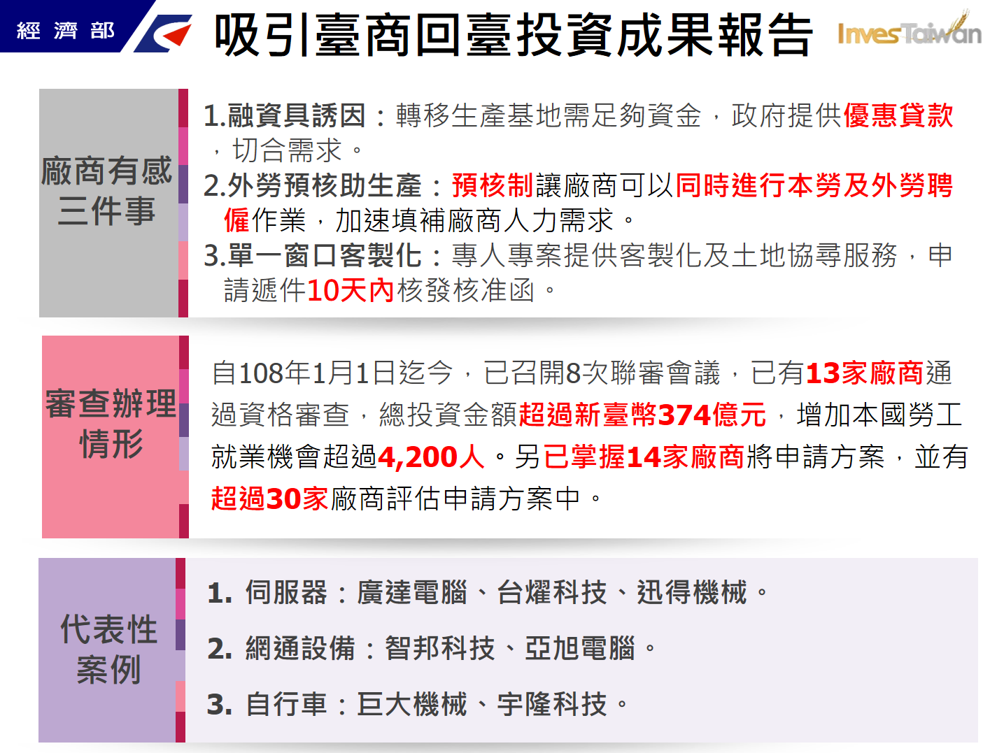 107年底由國發會研擬「歡迎臺商回臺投資行動方案」,再由經濟部負責廠商適用方案之資格審查,提供廠商在融資、勞工及土地等優惠措施,加速廠商返臺投資決策。盤點執行至今重要成果如下說明: